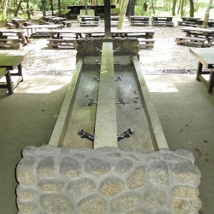 かまど6台と手洗い場を備えた、屋根付きの炊飯場が2棟あります。