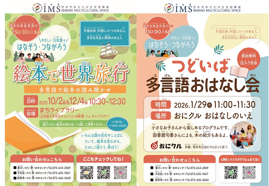 - 【分野】 文化・芸術 , 生涯学習・図書館 , 人権・国際 【開催場所・会場】 (1)(2)立命館大学まちライブラリー(3)(4)おにクル おはなしのいえ(5)おにクル3階 【開催日・期間】 11月06日(木曜日)ほか (1)10月2日木曜日10時30分~12時30分(2)12月4日木曜日10時30分~12時30分(3)11月6日木曜日11時00分~11時30分(4)1月29日木曜日11時00分~11時30分(5)11月6日木曜日14時30分~16時