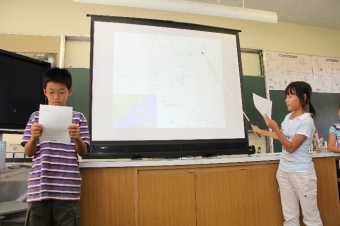 この日は、気象予報士3人が、5、6年生の児童に対して授業を行いました。授業では、前半に気象機器の説明や、天気図の見方など、天気予報の基礎知識の学習のほか、ペットボトルを使って雲を作る実験などを行い、後半では、班ごとに朝の天気図をもとに明日の天気予報を作成し、お天気番組形式で発表を行いました。児童はアナウンサーやお天気キャスターになりきって、楽しそうに発表し、「これで家でも天気の予想ができる!」と嬉しそうでした。