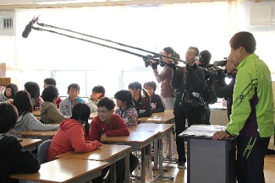 3日、春日小学校で、NHKのテレビ番組「課外授業ようこそ先輩」の収録が行われました。同小学校の卒業生である、お笑いコンビ「南海キャンディーズ」のしずちゃんこと、山崎静代さんが6年生のクラスを訪れ、特別授業を行いました。いつもの教室に、有名人とカメラマンがいる慣れない状況に、子どもたちも緊張気味でした。