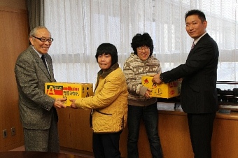 同社から市内50の障害者施設に送られたのは、10キロ入りのみかんが114箱、クリスマスケーキとノンアルコールのシャンパンで合計1017人分。同社は社会福祉に貢献できる活動が行えればと施設等への寄贈を行っており、本市にも平成21年から、夏にスイカ、冬にみかんとクリスマスケーキを福祉施設に寄贈しています。