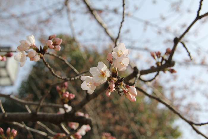 少し風が強いですが、日差しは明るくあたたかです。まだまだつぼみの木が多いですが、そのつぼみもほころび始め、ちらほらと桜の花が咲き始めています。