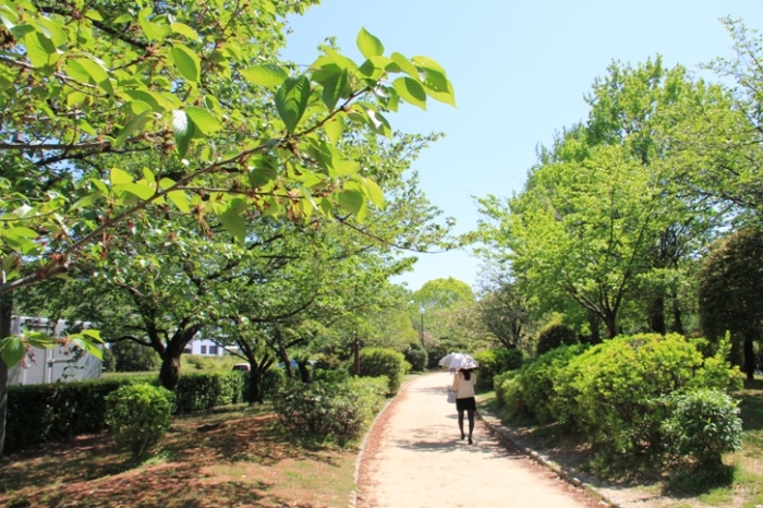 現在、市民さくらまつりが行われていた元茨木川緑地では、桜の花が散り、新緑の若葉が眩しい日差しの下、居心地のいい日陰をつくってくれています。
