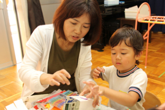 はじめに、PTA役員が見本を見せて作り方を説明したあと、園児らは保護者と一緒に製作に取り掛かりました。牛乳パックであらかじめ作ってある風鈴とかばんに、シールや色紙を貼り、マジックで絵を描いて作品を作ります。最後に保護者にひもを通してもらい、完成です。
