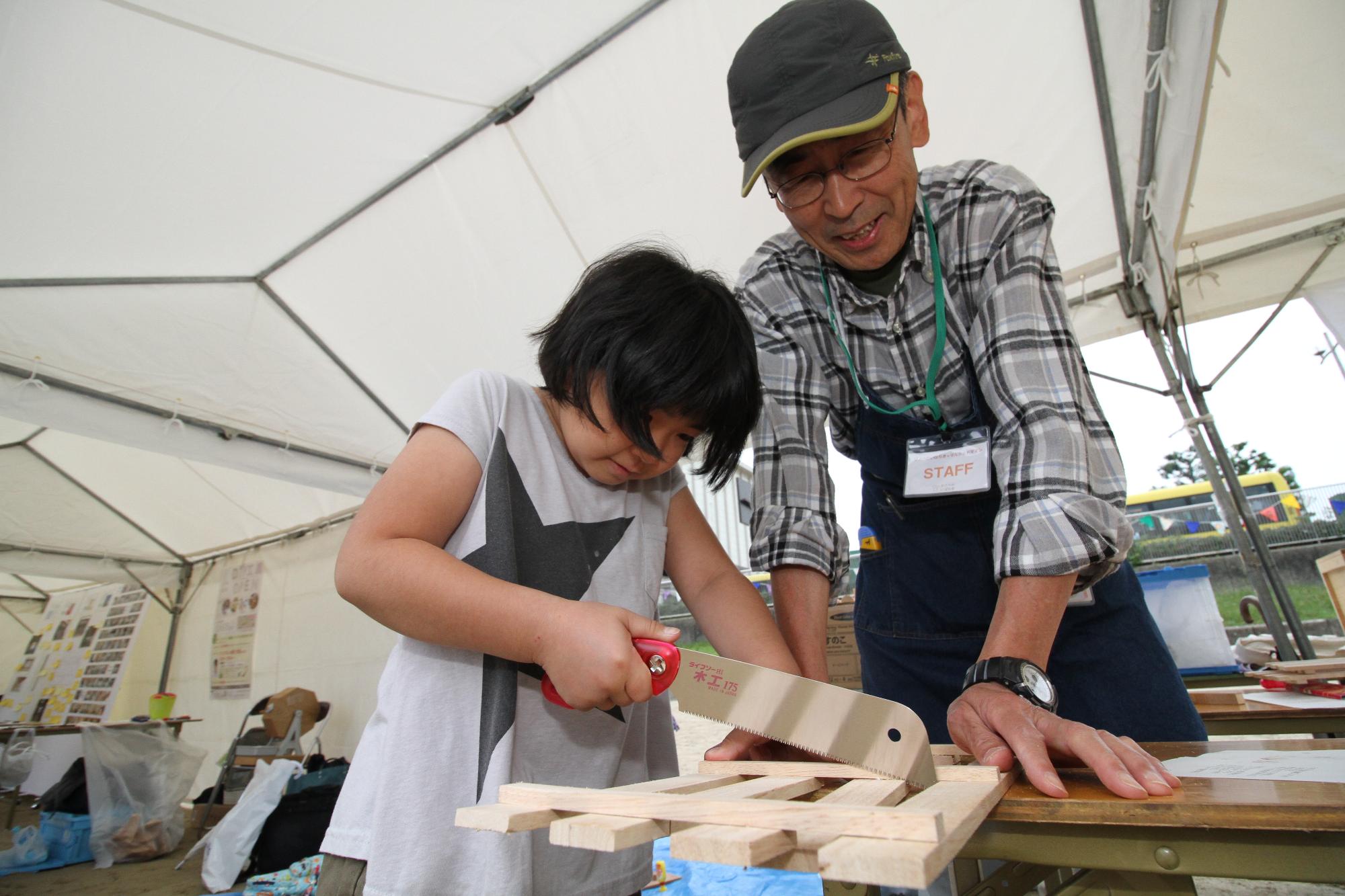 今回の「リノベのいばらき×マルシェドママン」は、市民にDIYを身近に感じてもらい、この取組みに興味を持つ人を増やすことが目的。「作って、買って、楽しんで!まるごと茨木を味わおう♪」をテーマに、クラフト体験などのワークショップ、人気ハンドメイド作家の作品・農産物・加工品販売などの、約50ブースが出店されました。リノベのいばらきブースでは、プロジェクトやDIY工房の紹介のほかに、DIY・木工セミナーも行われ、シェルフ(棚)作りや積み木工作を楽しむ親子連れで賑わいました。