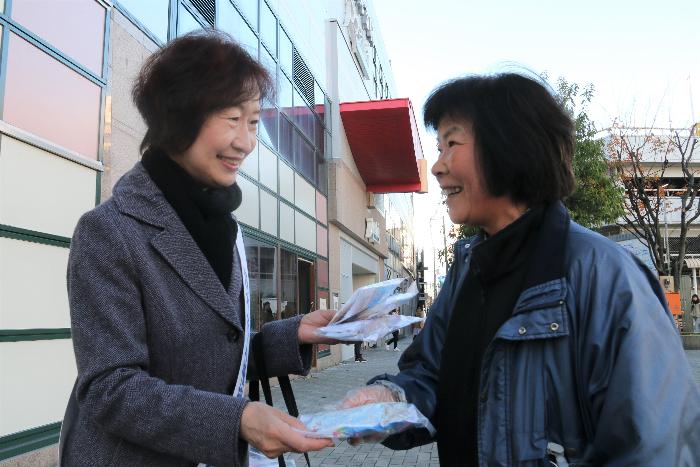12月4日~10日の人権週間を前に、12月1日、阪急茨木市・JR茨木の各駅前で、人権週間街頭啓発キャンペーンを実施しました。市人権擁護委員会委員など約30人が参加し、障害者団体が手作りしたアクリルたわしやコースター、啓発チラシを配り、人権意識の高揚を呼びかけました。