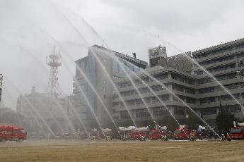 約3,000人の観衆が見守る中、初めに市消防本部、消防署、消防団をはじめ、市災害予防協会自衛消防隊の隊員や団員など総勢682人と、25台の消防車両が消防音楽隊の演奏に合わせて行進を行いました。続いて、本番さながらの消火・救助訓練や一斉放水を披露すると、会場は大きな歓声と拍手につつまれました。