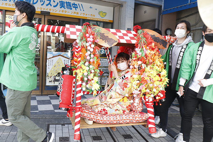 その後、4人の福娘を乗せた宝恵籠一行は、阪急茨木市駅前からJR茨木駅間を中心に市内のお店や商店街を巡行しました。太鼓の音や「商売繁盛で笹持って来い!」と威勢のいい掛け声とともに、多くの人に福を授けていました。