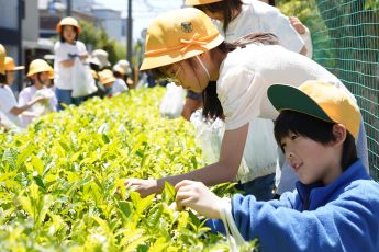 茶摘みを行ったのは、平成3年に学校の生け垣を整備した際、校庭沿い約50mに約400本植えられたお茶の木(ヤブキタ)の茶畑。平成5年から毎年行われているこの茶摘みを児童たちはとても楽しみにしており、人気の行事となっています。