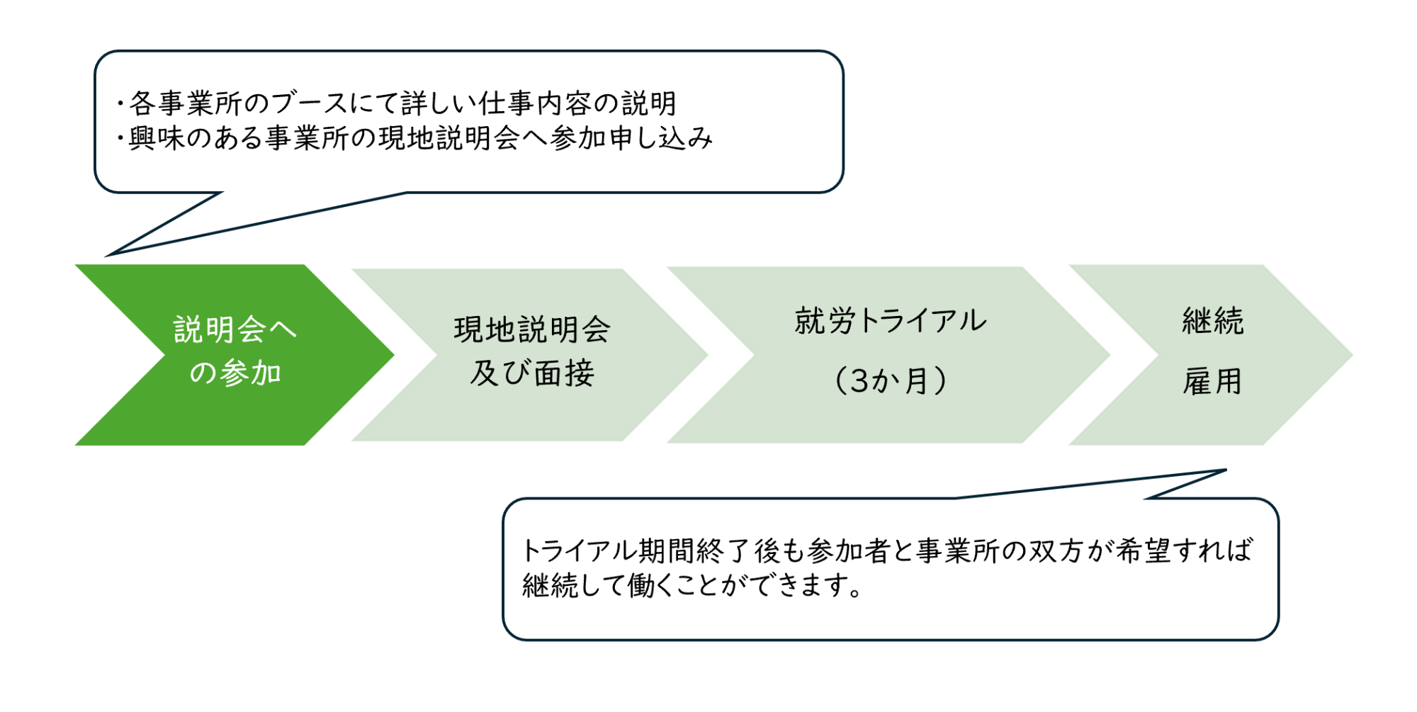 また、参加者と事業所の双方が希望すれば、トライアル終了後も継続して就労が可能です。