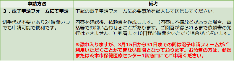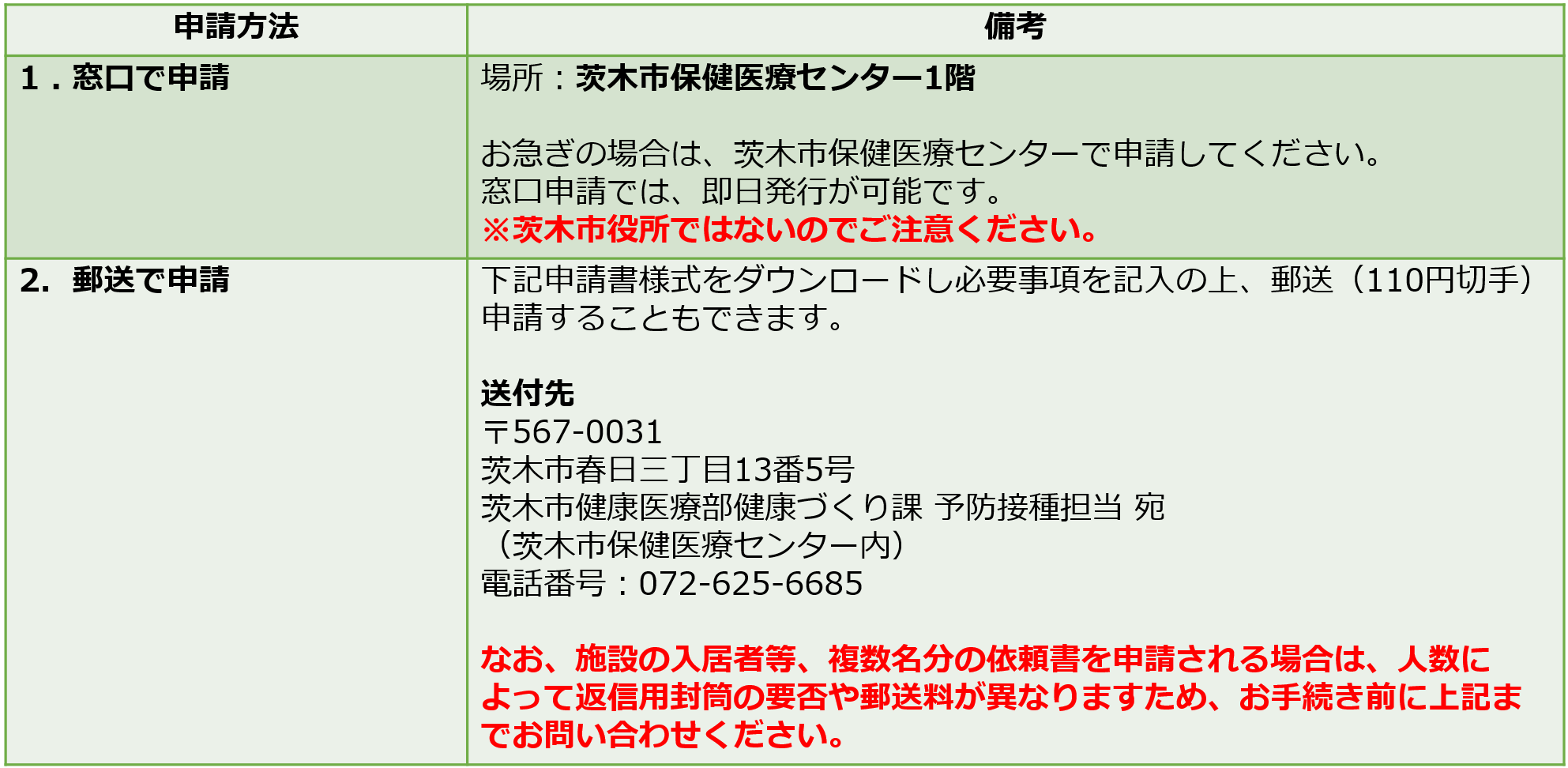 申請していただいてから郵送の場合、一定のお時間を要しますので、お急ぎの場合は直接、茨木市保健医療センター1階窓口にてお渡しすることもできます。
