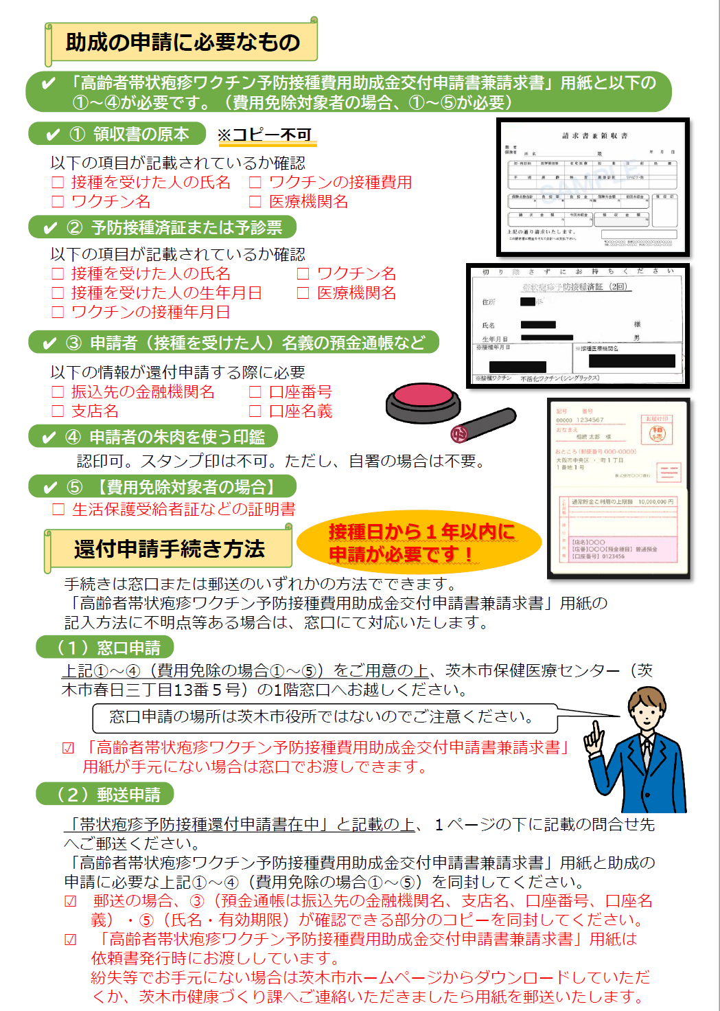 (高齢者帯状疱疹ワクチン予防接種の対象者で、接種費用が無料となる人のみ。郵送の場合はコピー)