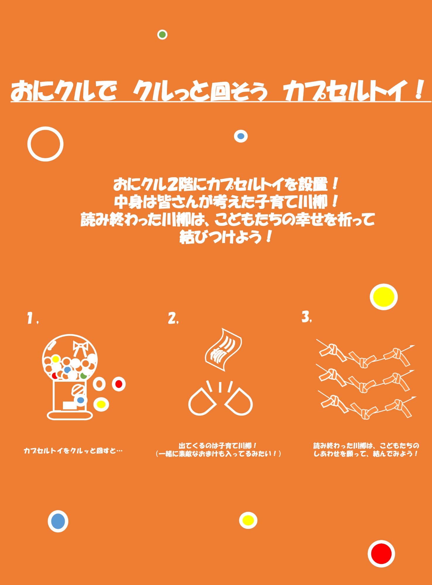 日頃子育てで感じるあるあるやちょっと笑えるエピソードを川柳形式で募集。カプセルトイから出てくるオレンジ色の短冊(川柳)をこどもたちの幸せを祈って、おにクル2Fに結んでもらうイベントです。