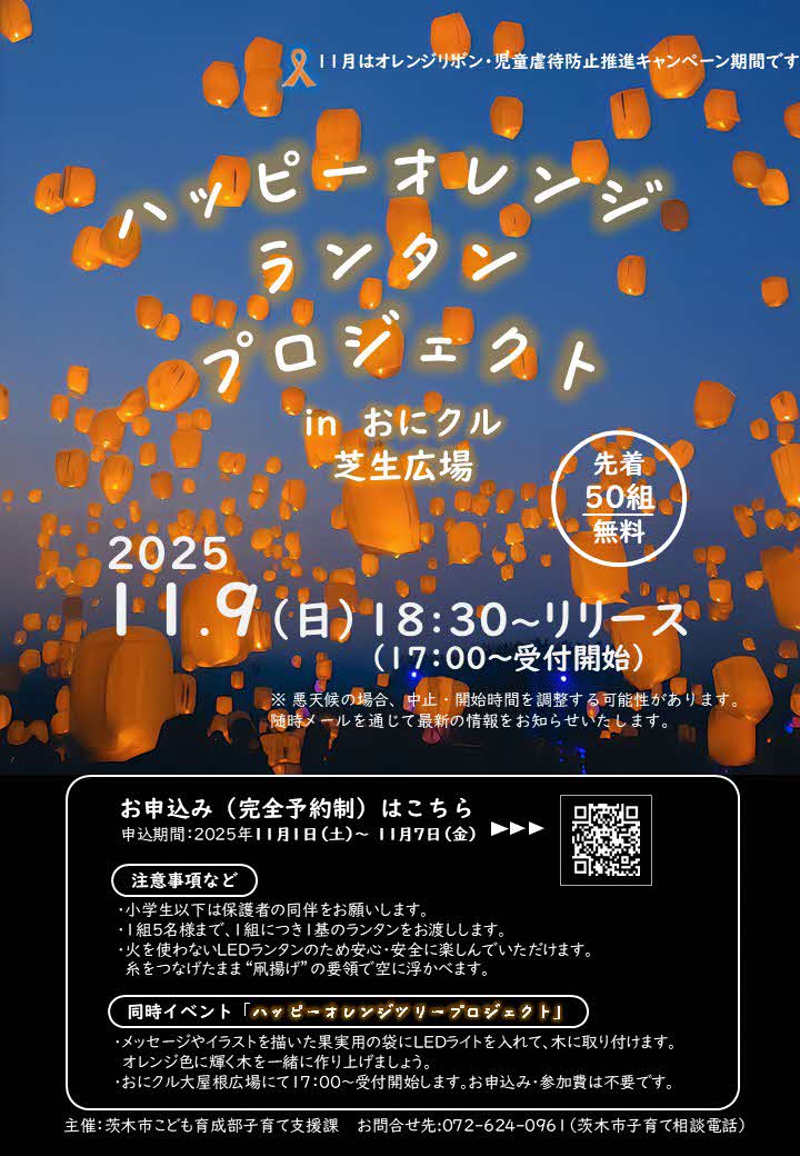 児童虐待の根絶を願い、オレンジリボンキャンペーンのシンボルカラーであるオレンジ色のランタンを(火気不使用)をおにクル芝生広場で夜空に一斉にリリースします。
