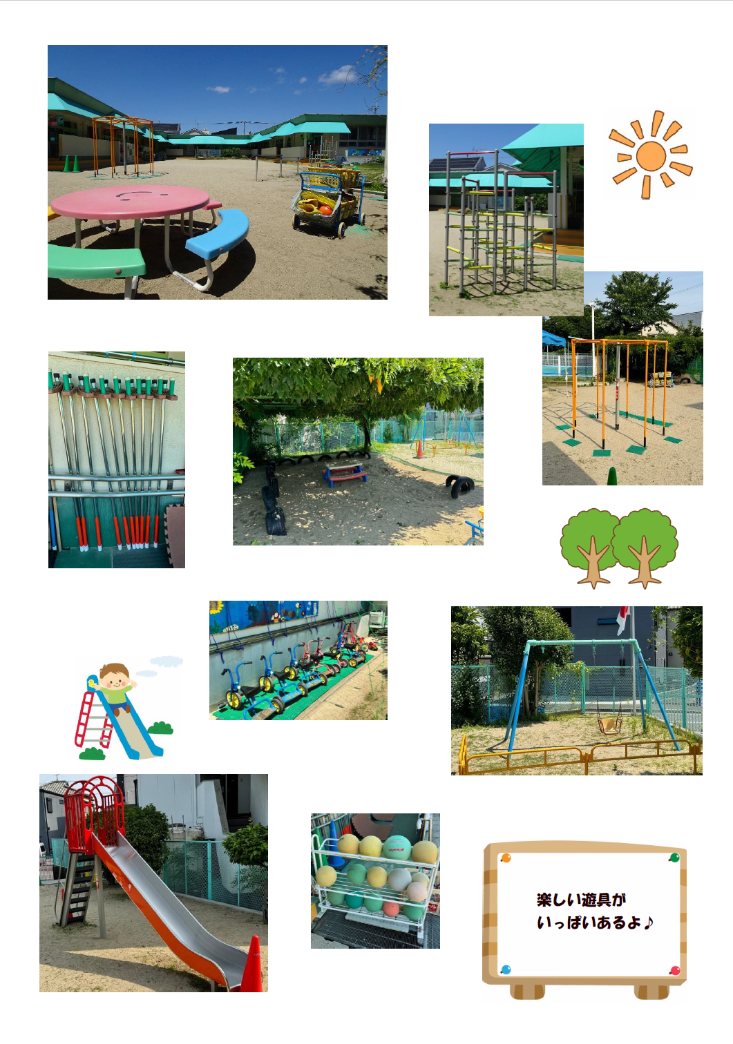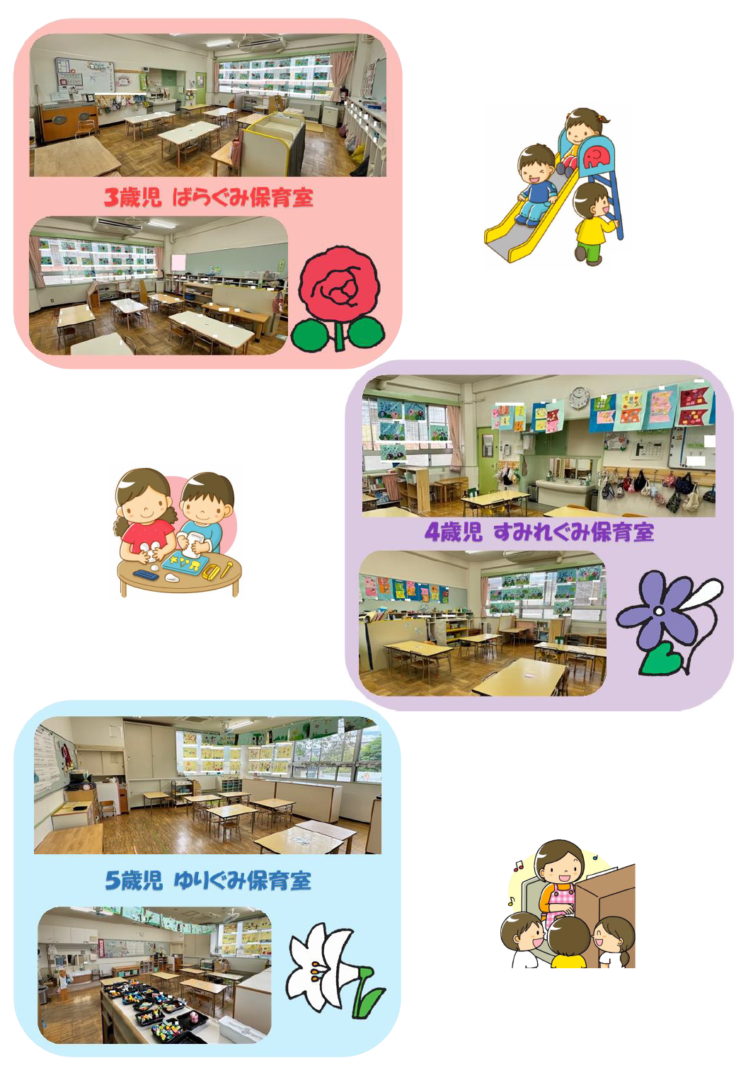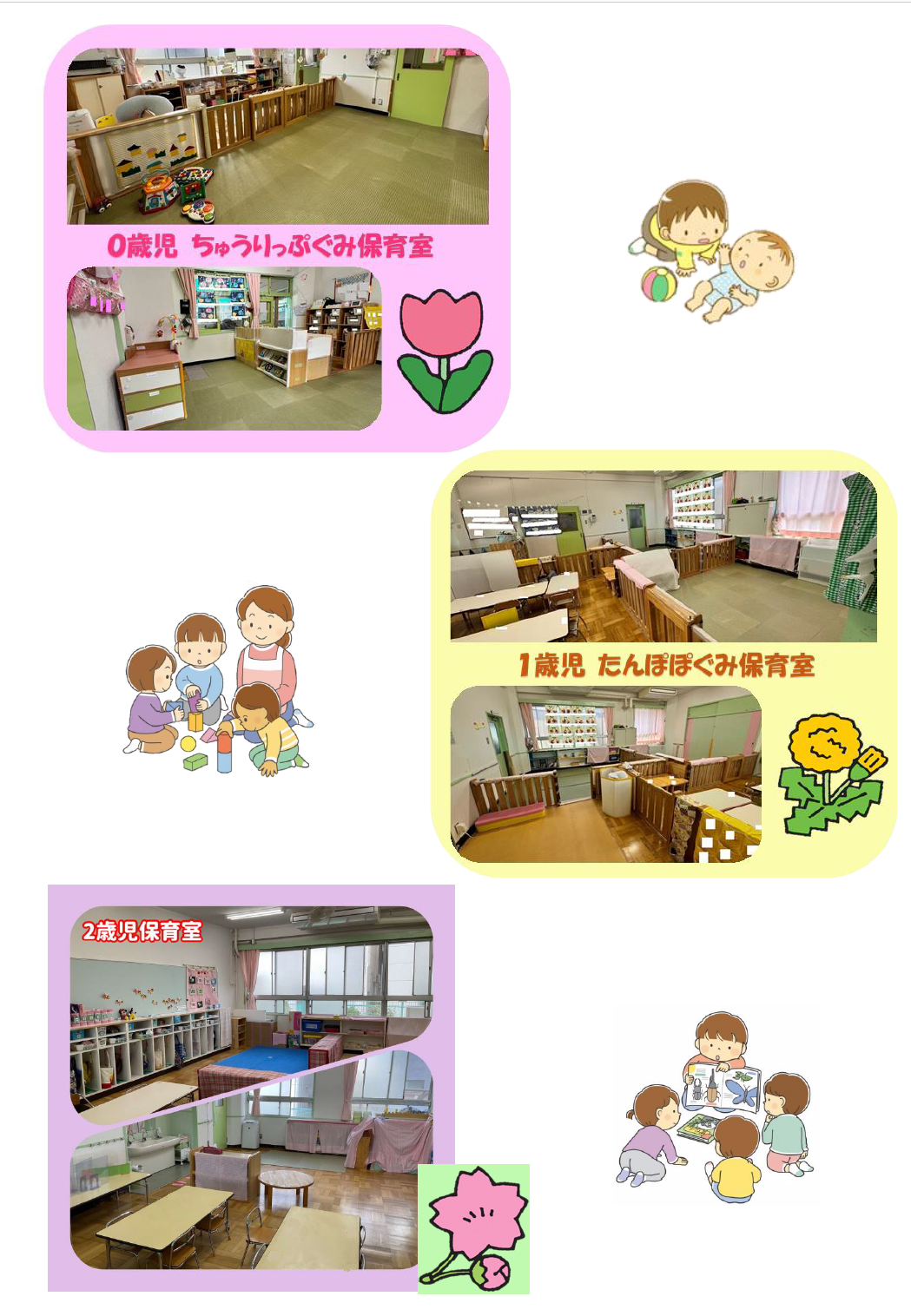 施設紹介 更新日:2026年03月31日 ページID: 64550 定員 定 員 : 90名 対象年齢 : 0歳児(生後8週間以上)~5歳児 開所時間 7時~19時 ※7時~7時30分、18時30分~19時は延長保育 日曜日、祝日、年末年始(12月29日~1月3日)は休所です 所庭 保育室(乳児) 保育室(幼児)