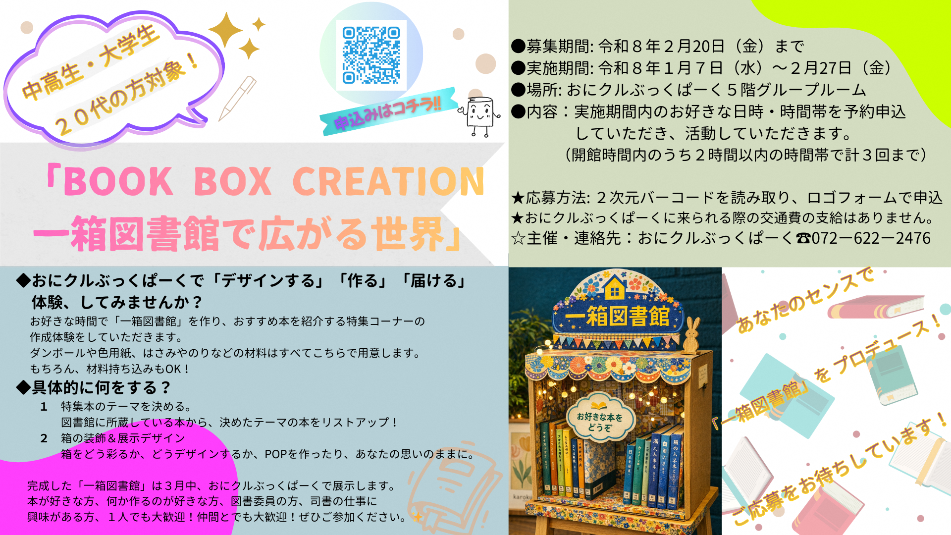 箱をどう彩るか、どうデザインするか、POPを作ったり、あなたの思いのままに。 完成した「一箱図書館」は3月中、おにクルぶっくぱーくで展示します。 募集期間令和8年2月20日(金曜日)まで 実施期間令和8年1月7日(水曜日)~2月27日(金曜日) 場所おにクルぶっくぱーく5階グループルーム 内容実施期間内のお好きな日時・時間帯を予約申込していただき、活動していただきます。(開館時間内のうち2時間以内の時間帯で合計3回まで) 応募方法2次元バーコードを読み取り、フォームで申込 主催・連絡先おにクルぶっくぱーく 電話072ー622ー2476 |
