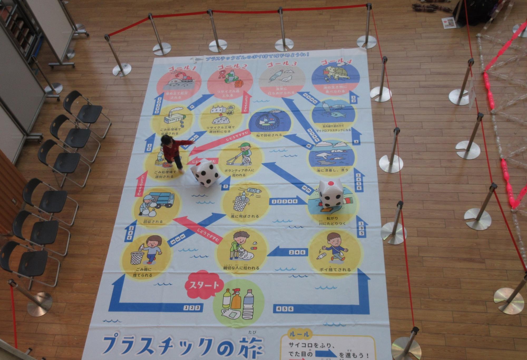 概要:参加者の皆さんと力をあわせて、ペットボトルのタワーづくりに挑戦しました。ツリーの組み立て後は、正二十面体などの立体の組み立てを行いました。会場には、自分がコマになって大きなサイコロを振って進む「等身大プラスチックの旅すごろく」のコーナーも設けました。