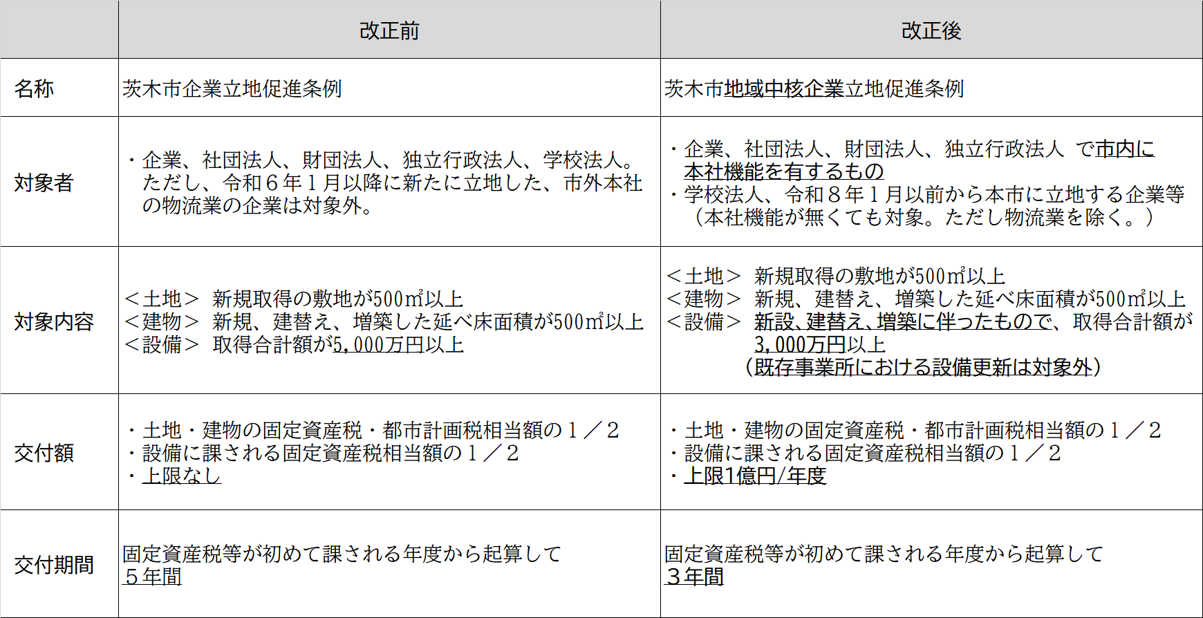 この度、旧企業立地促進条例が改正され、「茨木市地域中核立地企業促進条例」へと名称が変わりました。また奨励金の対象者や交付要件が改正され、令和8年1月1日より施行されました。