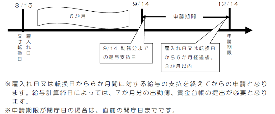 対象となる市民を正規労働者として雇用した日、又は正規労働者へ転換した日から6か月経過後、3か月以内かつ、6か月分の給与を支払った後
