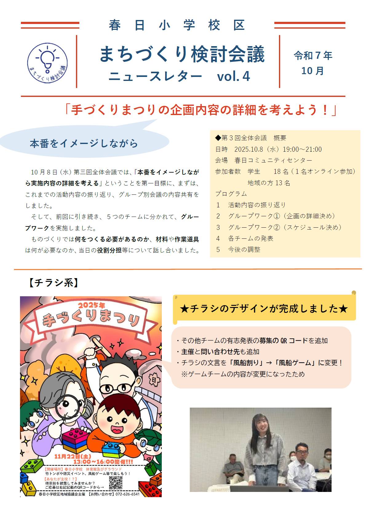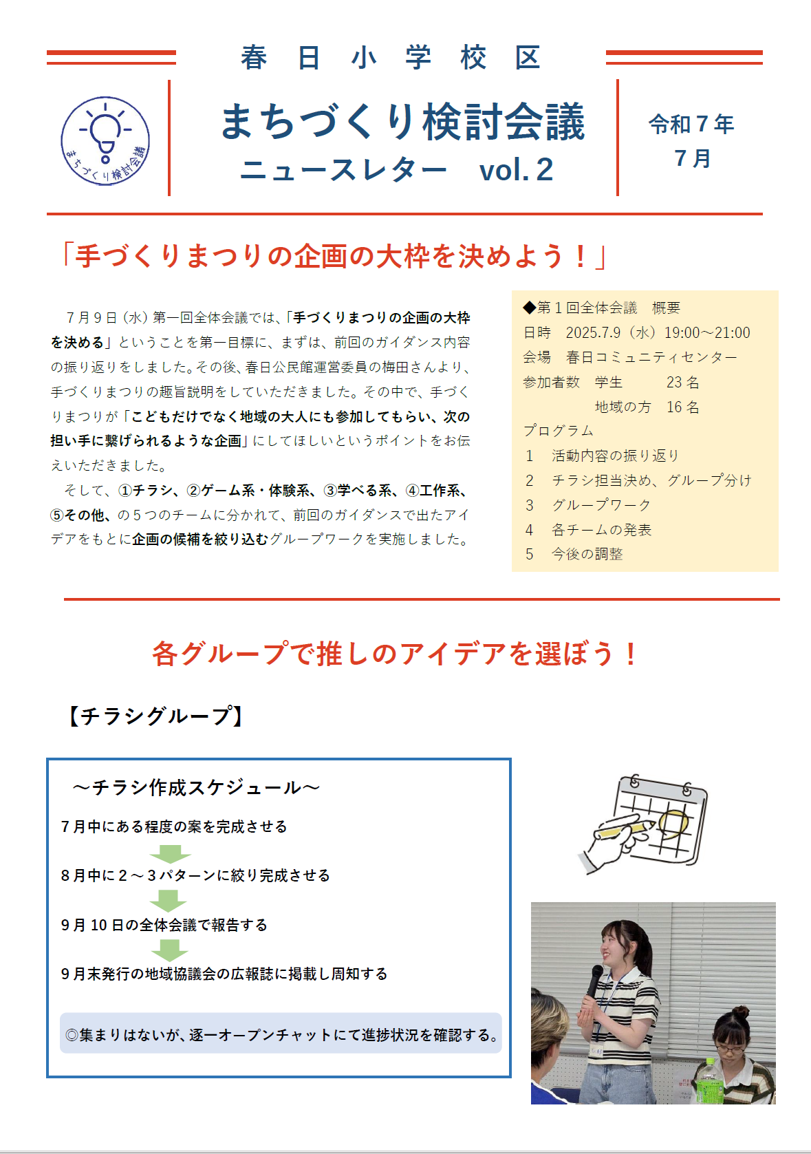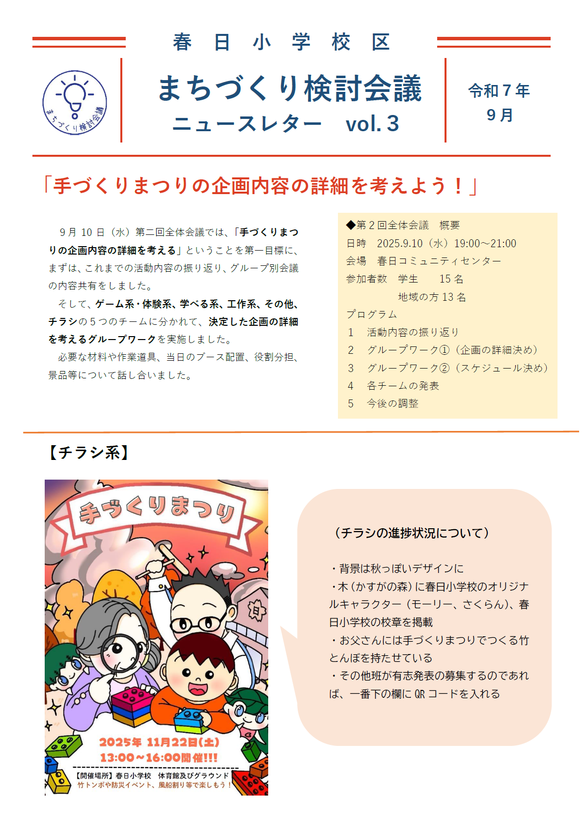 春日地区では、世代を超えてものづくりや学び、交流を通して楽しめる「手づくりまつり」を学生と地域の方が一緒に企画し、運営します。また、「手づくりまつり」のチラシを見た人が参加してみたくなるように、学生視点でデザインし、地域の方にPRします。