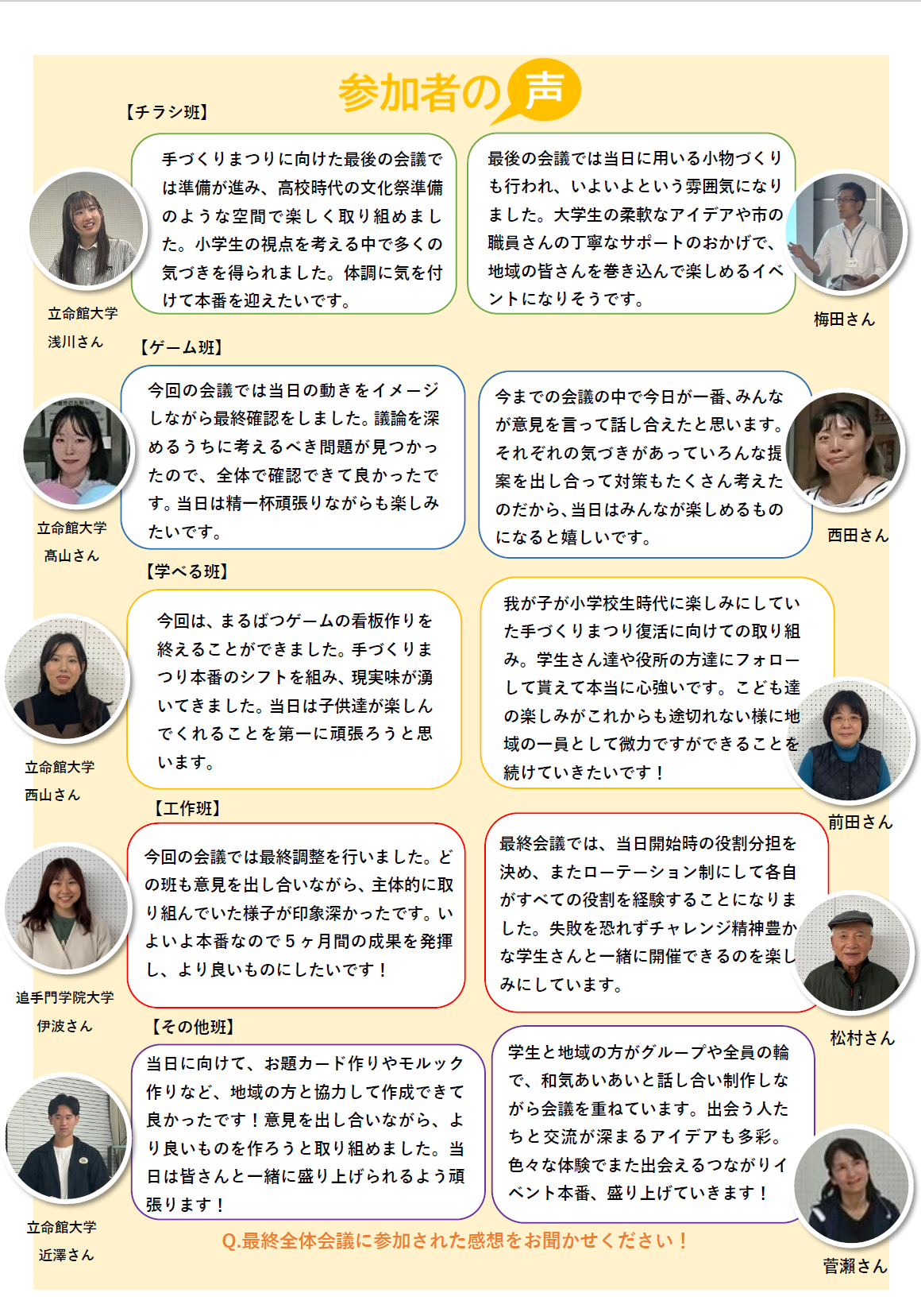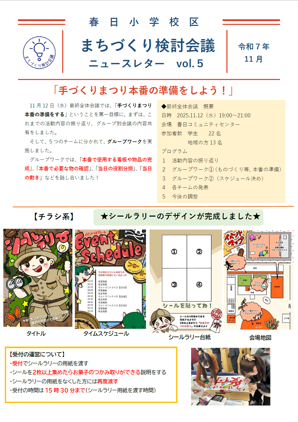 令和7年11月12日(水曜日)の最終全体会議では、「手づくりまつり本番の準備をする」ということを第一目標に、5つのチームに分かれてグループワークを実施しました。