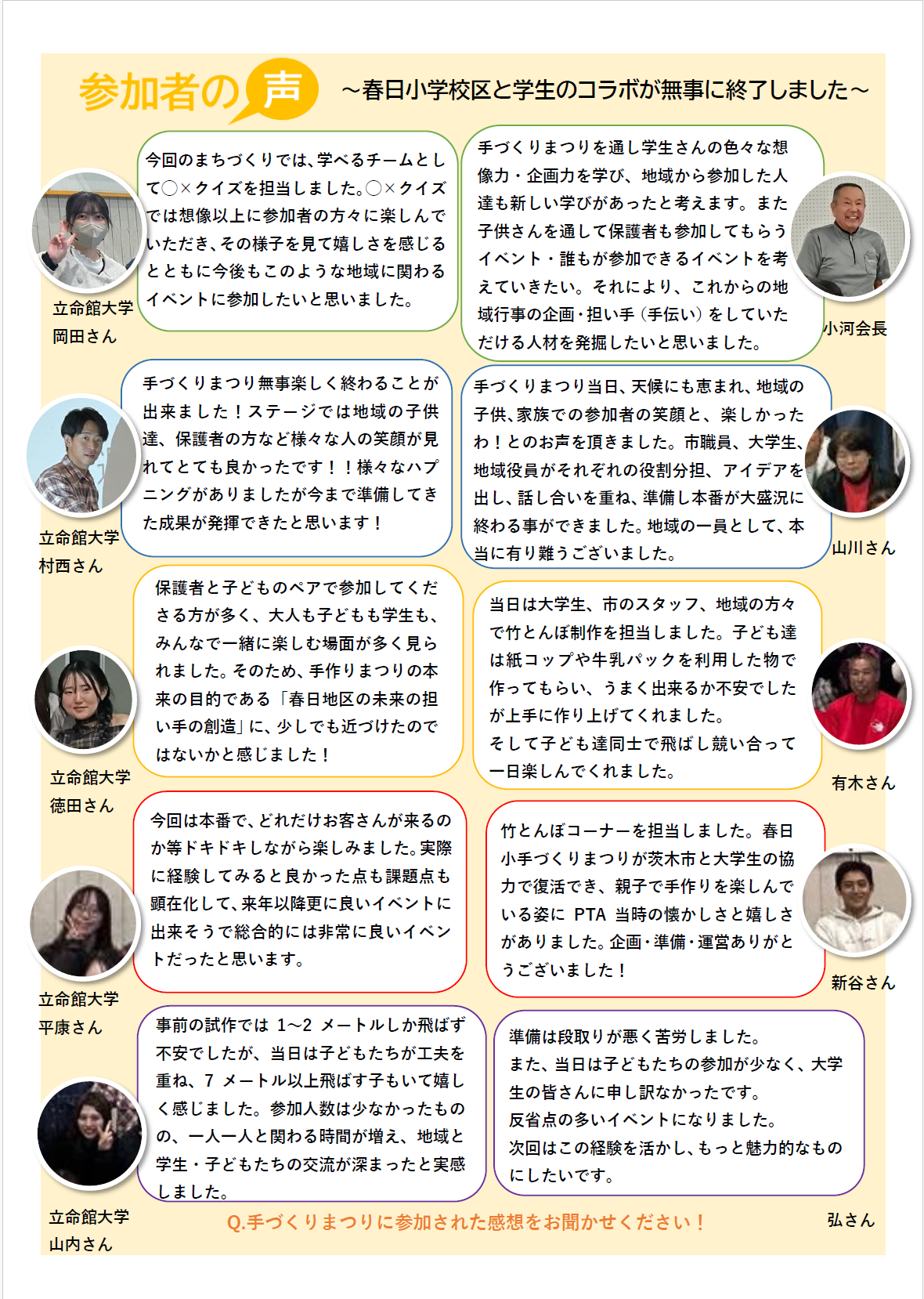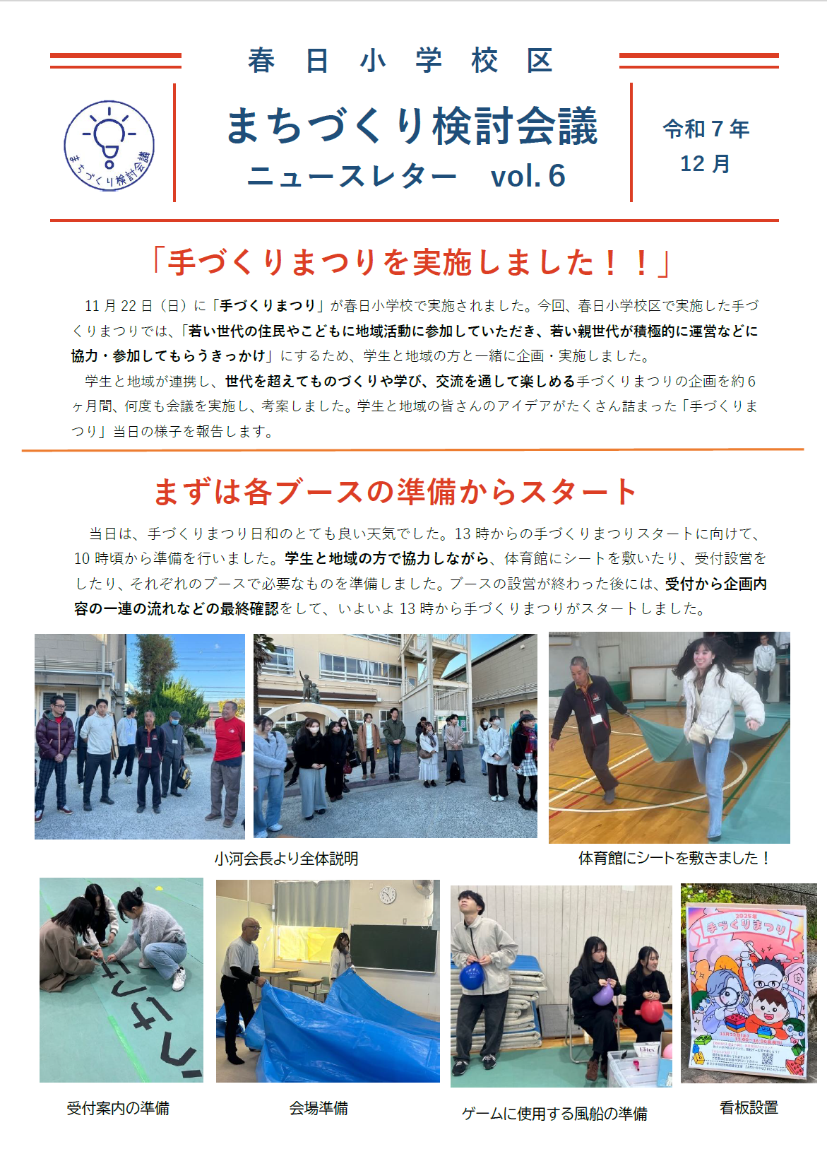 11 月22 日(日曜日)に「手づくりまつり」が春日小学校で実施されました。学生と地域が連携し、世代を超えてものづくりや学び、交流を通して楽しめる手づくりまつりを実施しました。当日の詳細については、下記の開催報告資料をご確認ください。