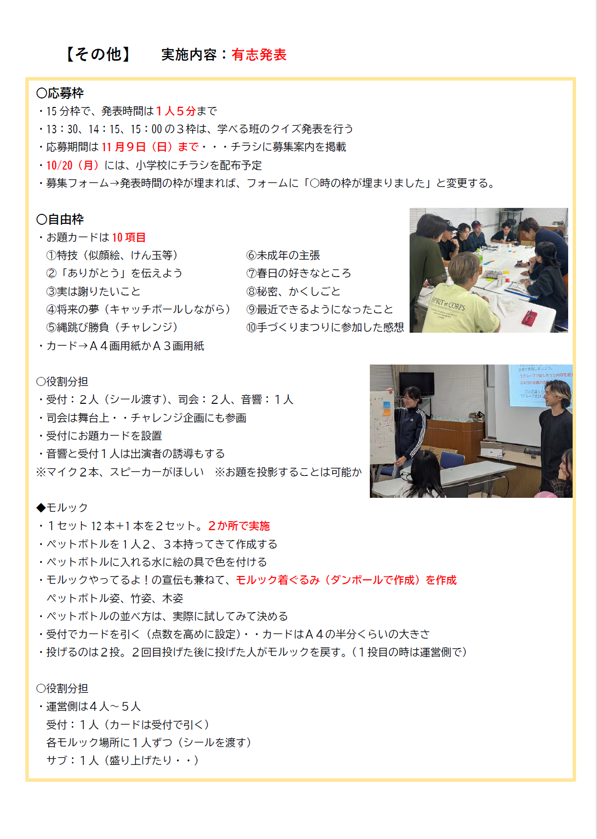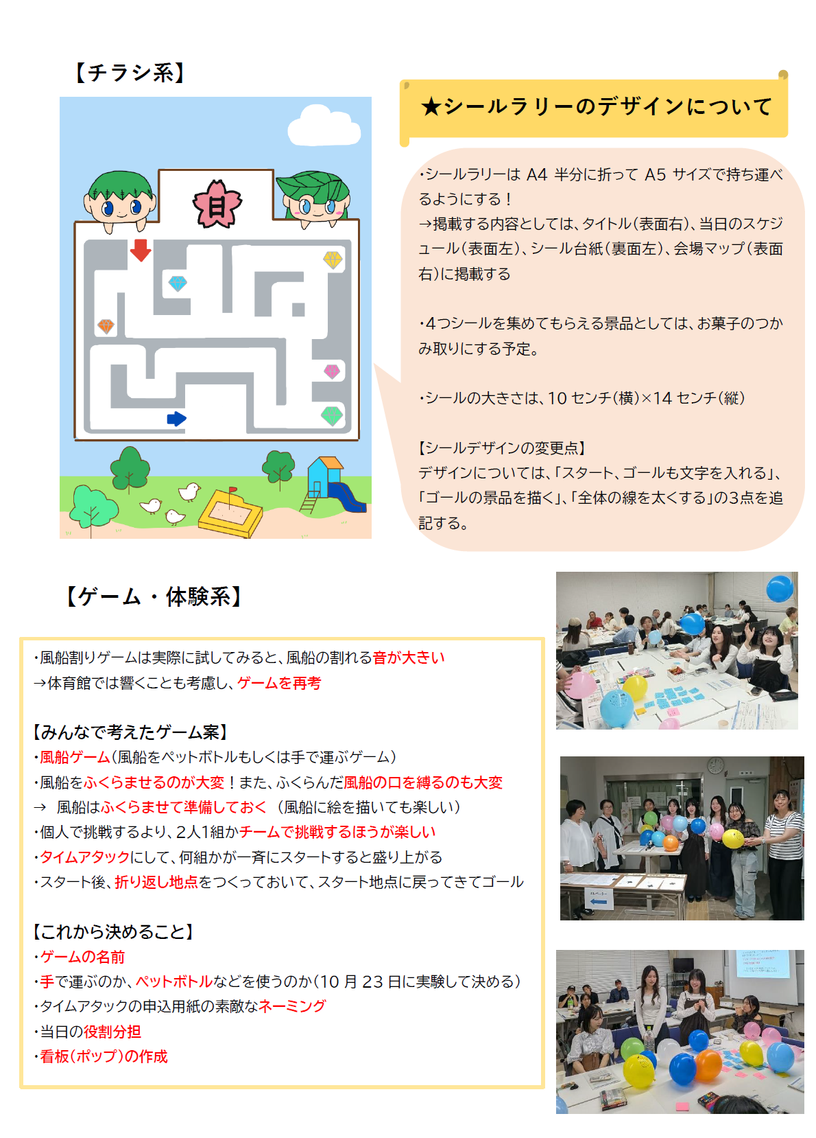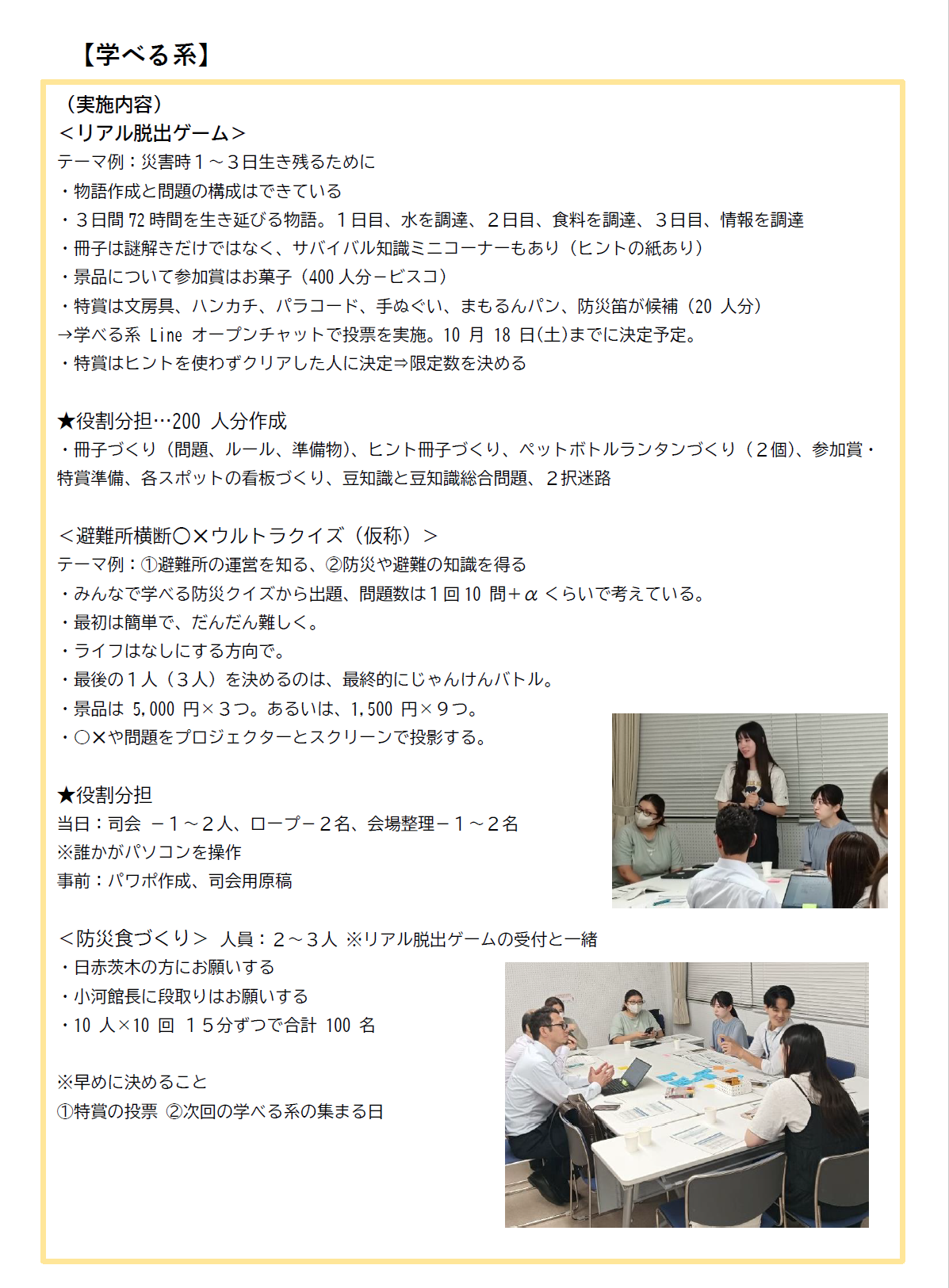 令和7年9月10日(水曜日)に、前回の振り返り、グループ別会議の内容共有をした後、チームに分かれて、前回決定した企画の詳細を考えるグループワークを実施しました。