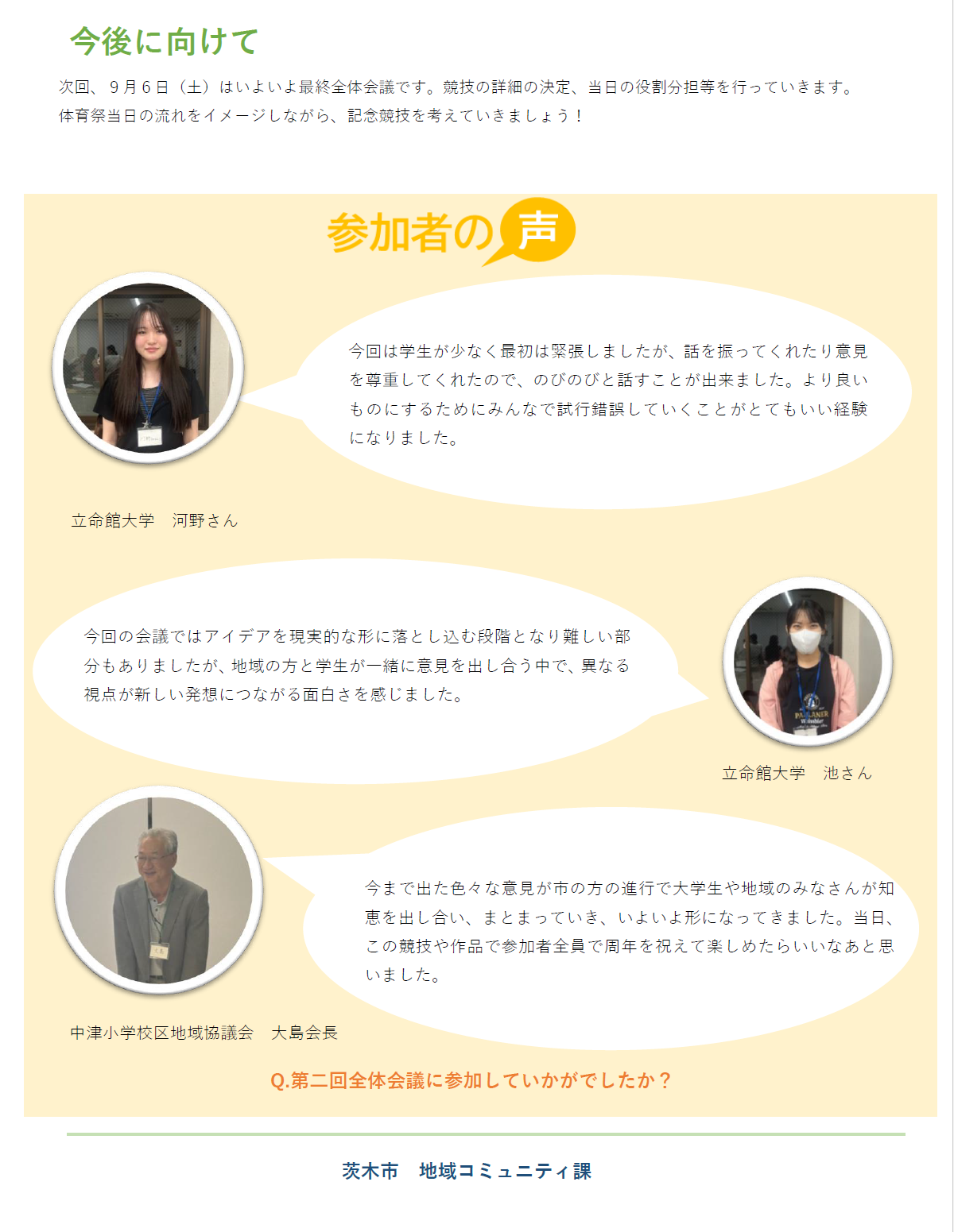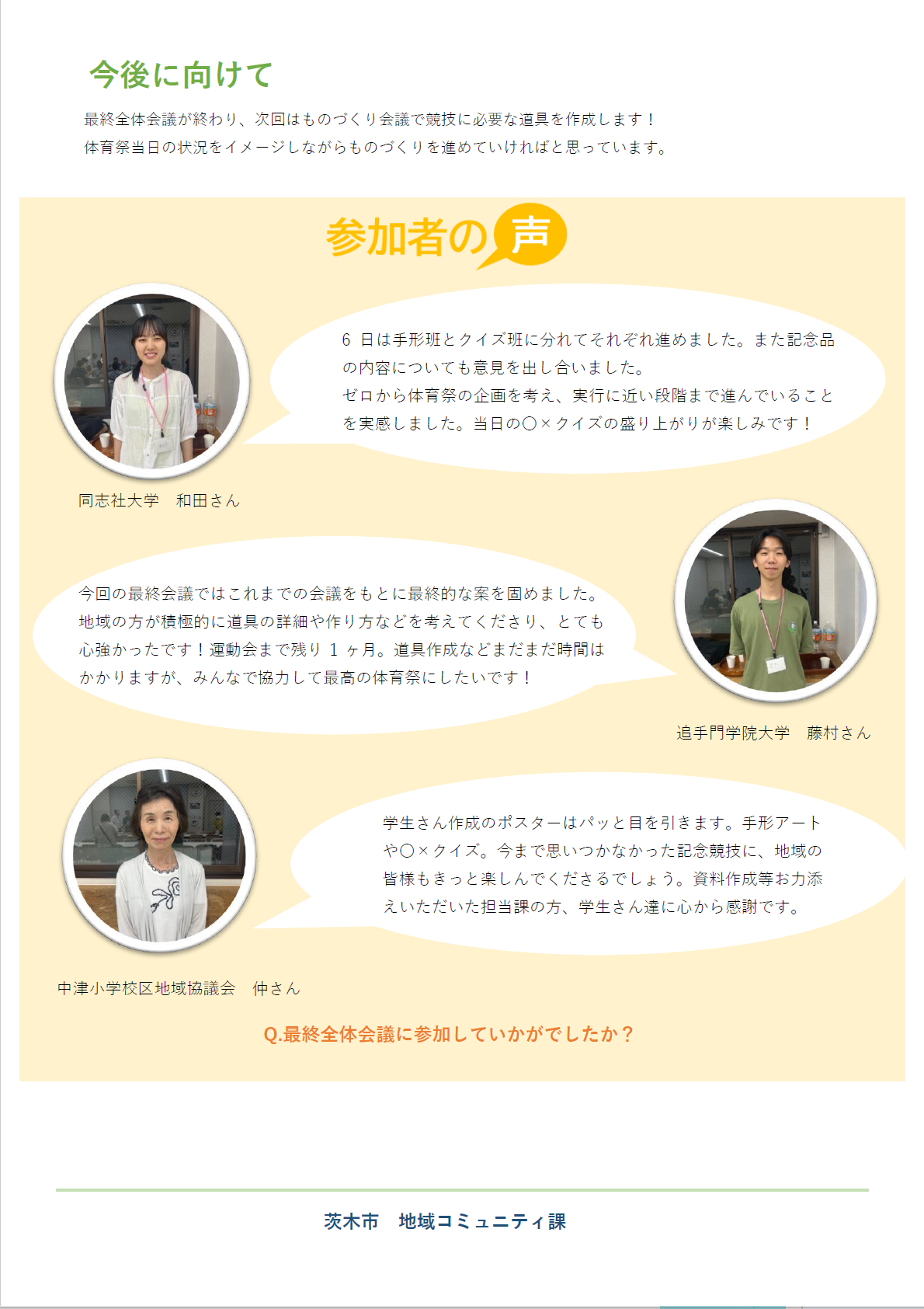 中津小学校区では、自治会連合会50周年、コミュニティセンター30周年、地域協議会10周年の記念事業として、「地区体育祭の記念競技」を学生と地域の方が一緒に企画し、実践します。また、たくさんの人に「面白そう!」と思ってもらえるようなポスターを学生視点でデザインし、地域の方に地区体育祭のPRをします。