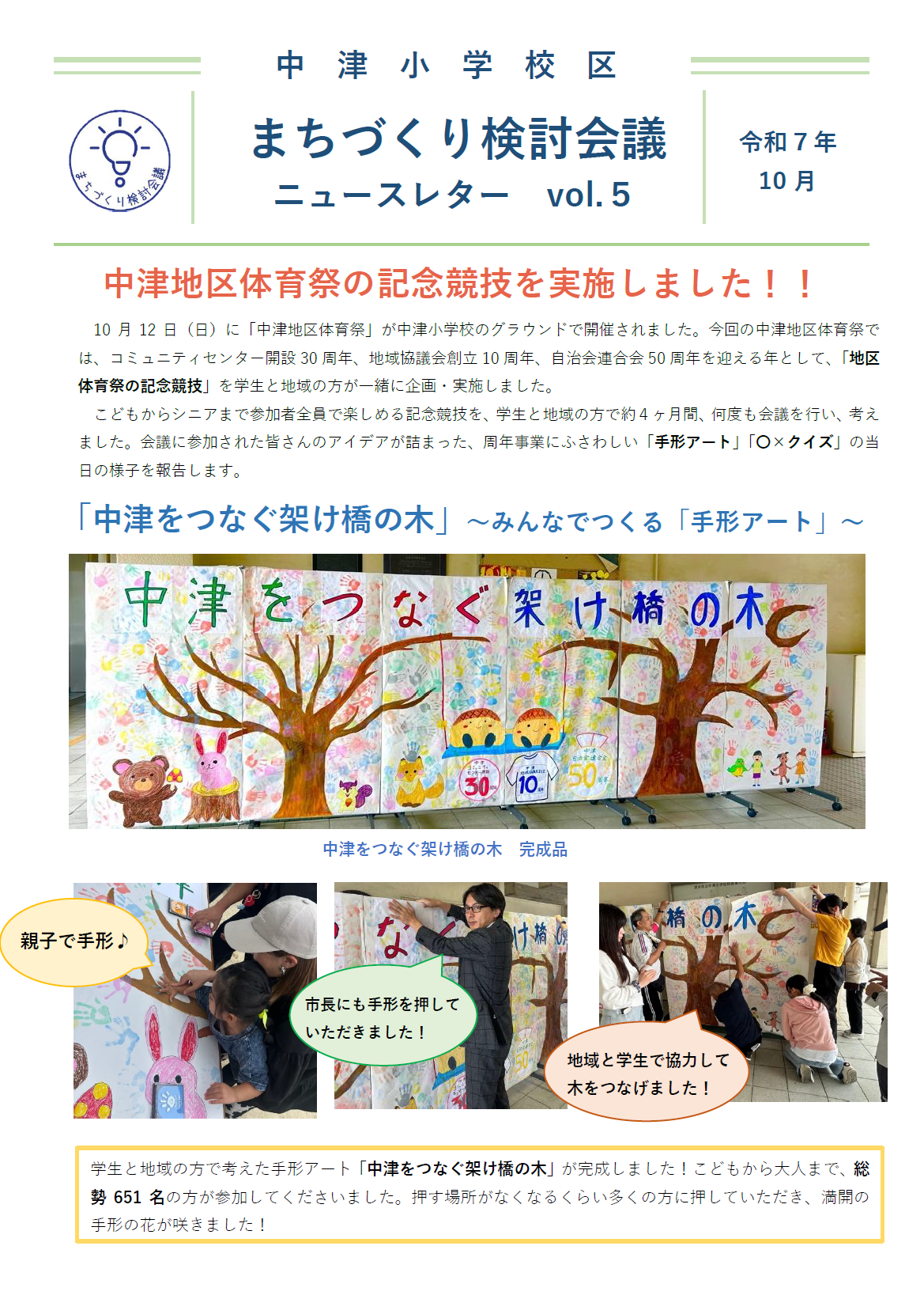 令和7年10月12日(土曜日)に、「中津地区体育祭」が中津小学校のグラウンドで開催されました。学生と地域の方のアイデアが詰まった、周年事業にふさわしい「手形アート」「〇×クイズ」の当日の詳細については、下記の開催報告資料をご確認ください。