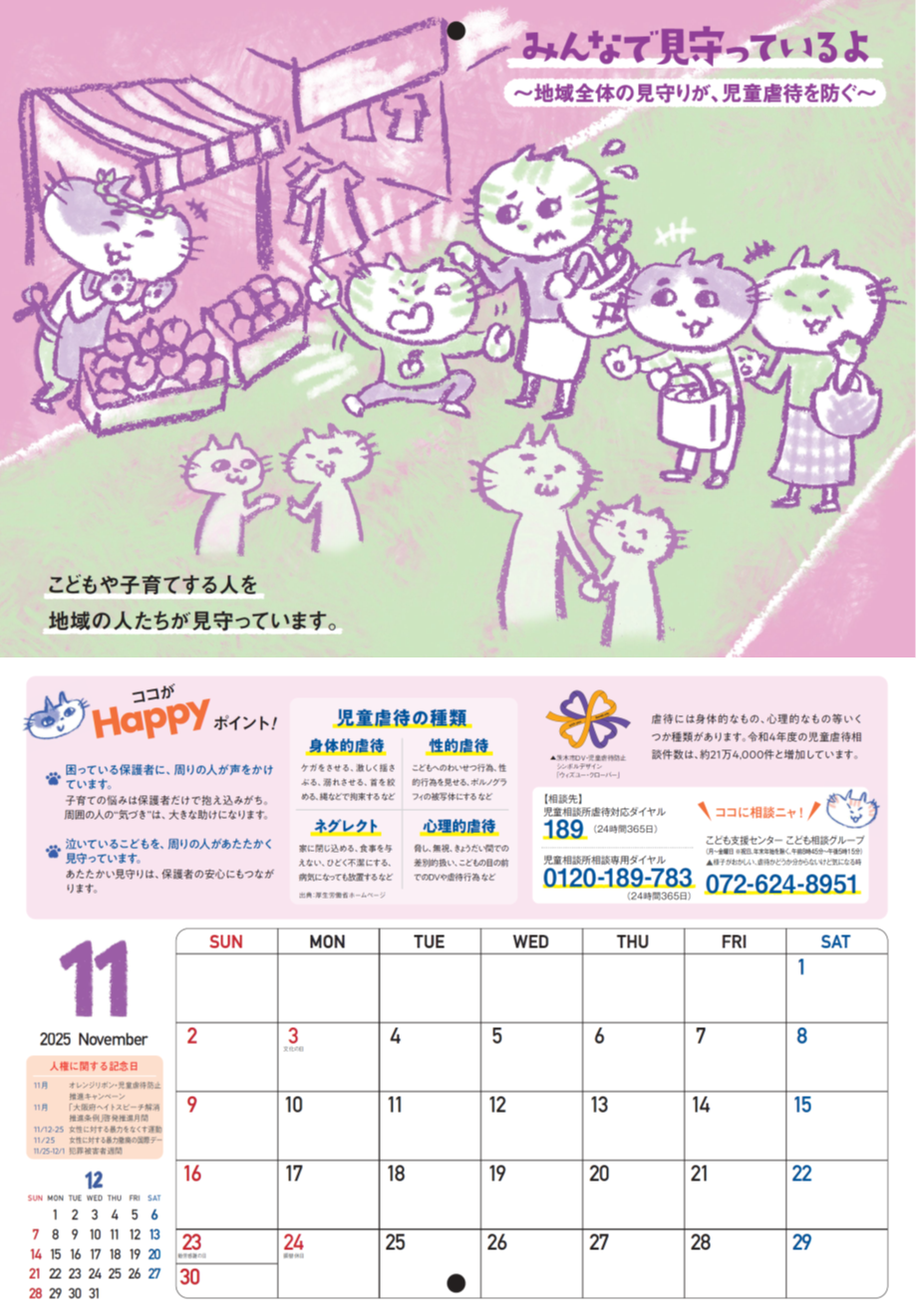 11月の人権・男女共同参画啓発カレンダー‘‘みんなで見守っているよ~地域全体の見守りが、児童虐待を防ぐ~”