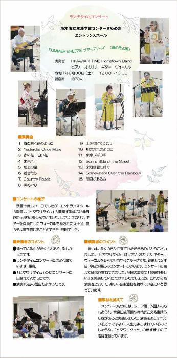 【令和7年8月30日初出演】ランチタイムコンサート~HIMAWARI TIME Hometown Band 更新日:2025年11月24日 ページID: 68045 HIMAWARI TIME Hometown Band~SUMMER BREEZE~ HIMAWARI TIME Hometown Band (PDFファイル: 5.5MB)