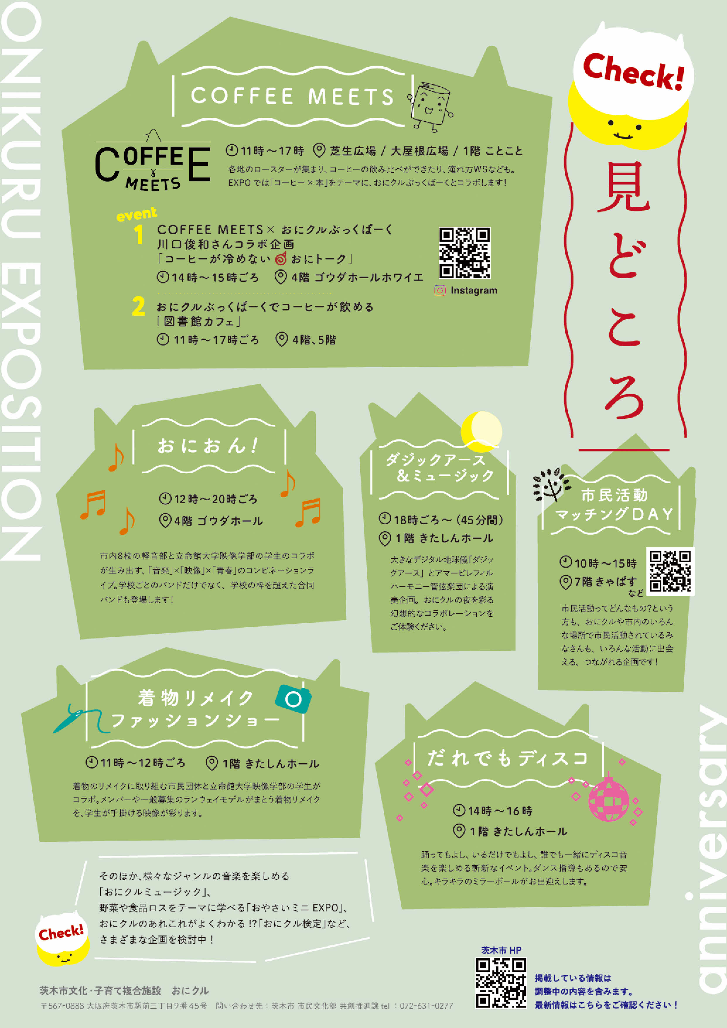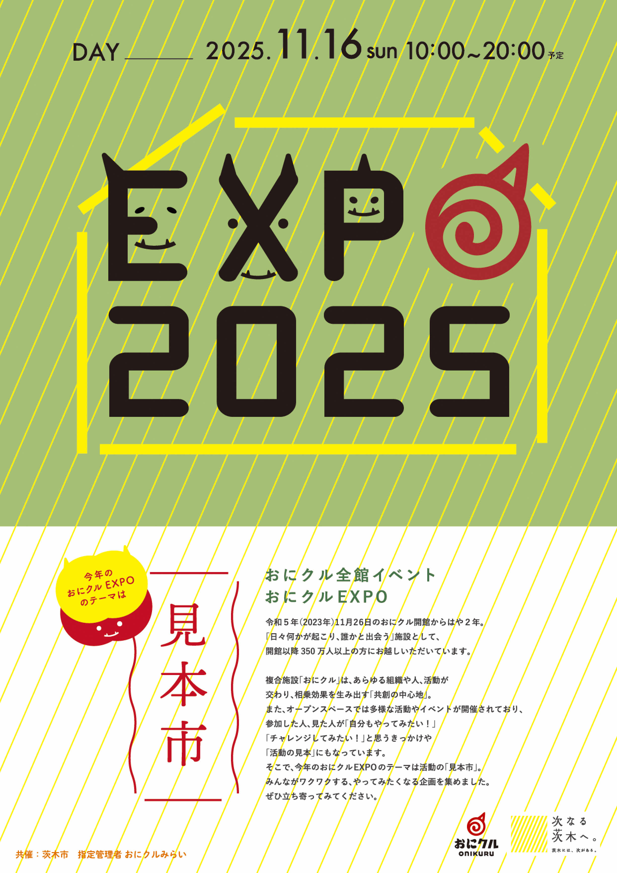 おにクル全館イベント「おにクルEXPO」を今年も開催します! 今年のテーマは活動の「見本市」。 これまで市内のあちこちで行われていた様々な活動が、おにクルで出会ったり、掛け合わされたりして…見たことない企画、実験的な取組の見本市になります。 おにクルの館内や芝生広場を使って様々な催しが行われます。この機会にぜひお越しいただき、一緒に2周年をお祝いしましょう! (※内容は随時更新していく予定です。)