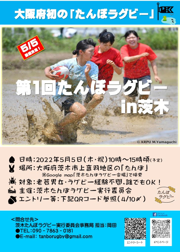 茨木市スポーツ交流事業 更新日:2022年06月02日 ページID: 58090 令和4年5月5日(木曜日)に茨木市上音羽地区にて田植え前の田んぼを活用し、「たんぼラグビー」が開催されました。 晴天の下、約300人の参加者が集まり、全身泥まみれになりながらも楽しそうにラグビーボールを追いかけていました。