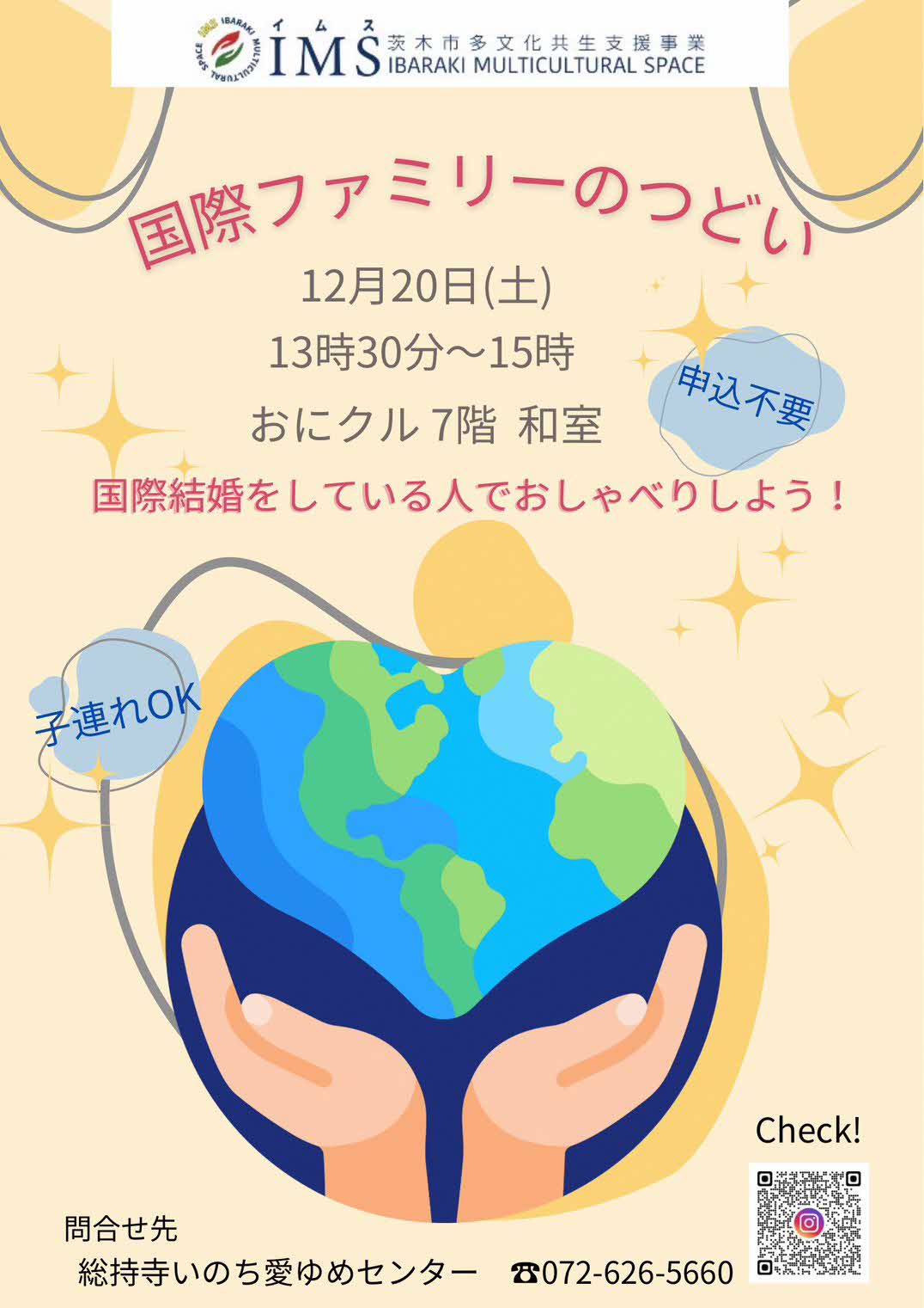【12月20日開催】国際(こくさい)ファミリーのつどい国際結婚(こくさいけっこん)をしている ひとたちで はなします。 とき: 12がつ20にち 午後(ごご)1じ30ふん~午後(ごご)3じ ばしょ:りつめいかんだいがく まちライブラリー