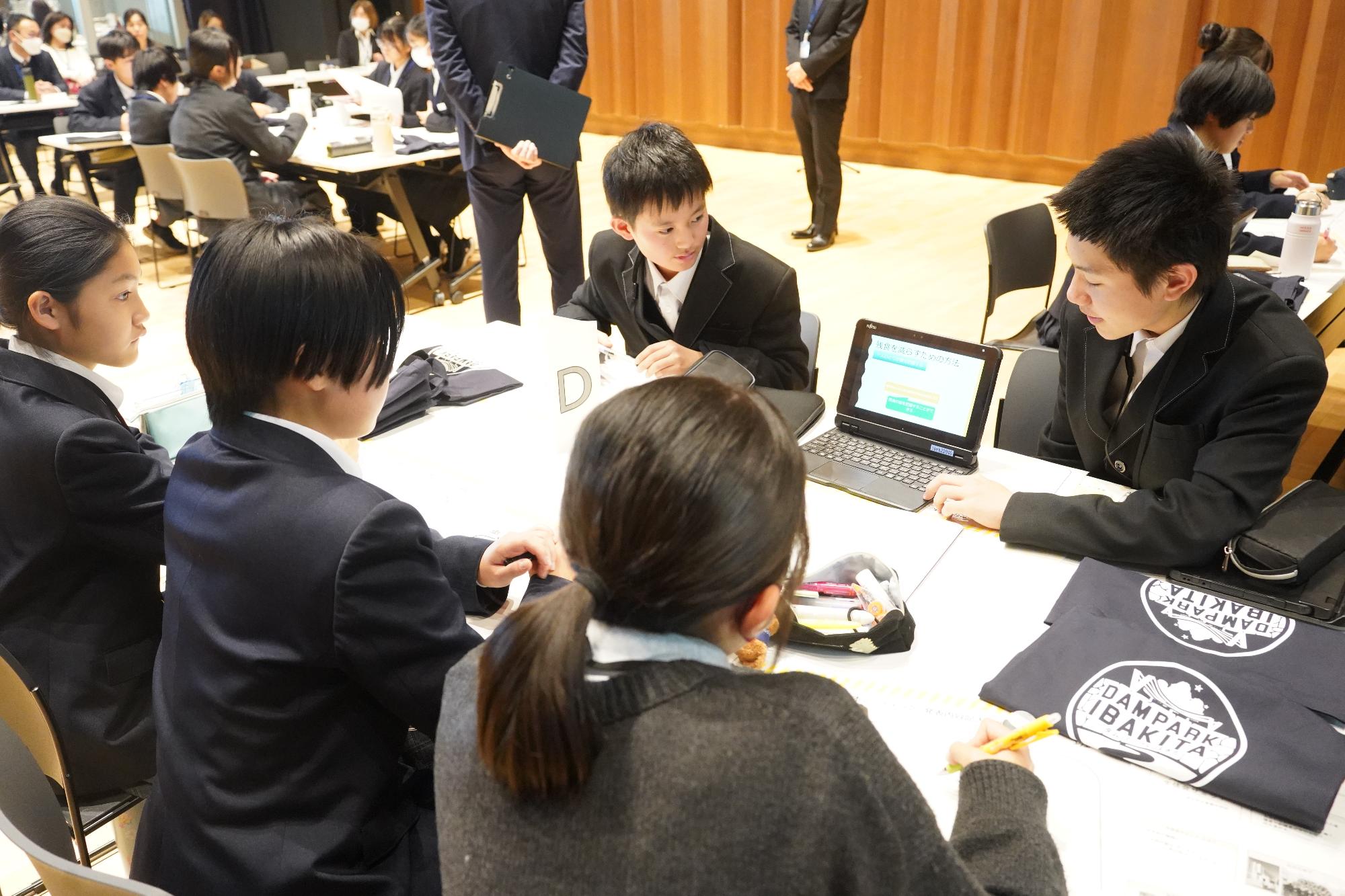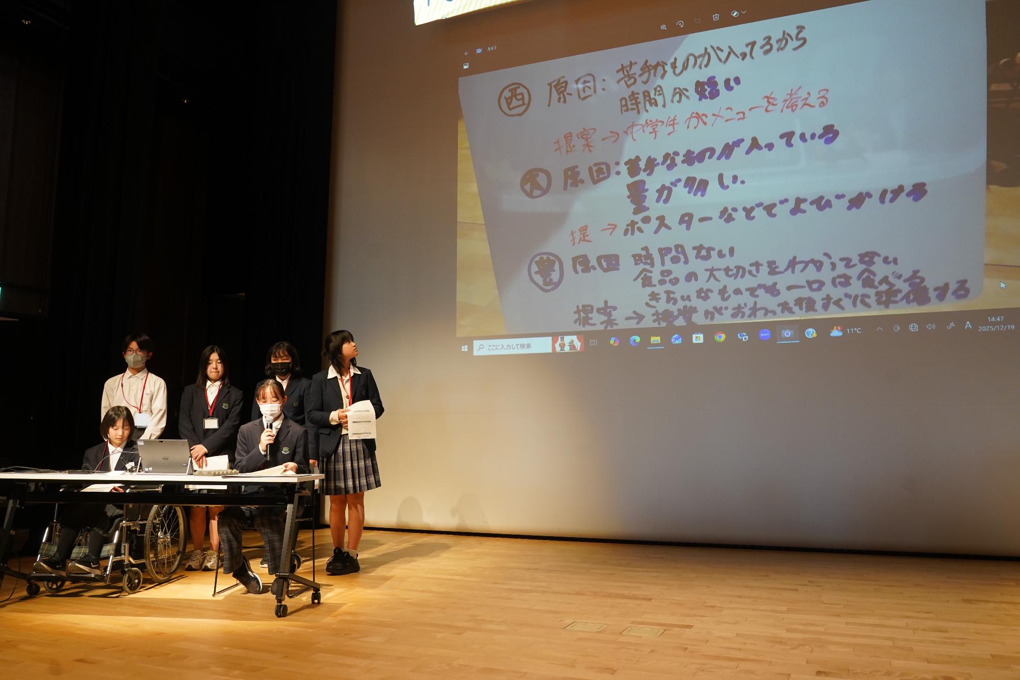 生徒たちは、中学校給食の残食を減らすために、自分たちでできる取り組みやアイデアを、A〜Eの各グループに分かれて発表しました。