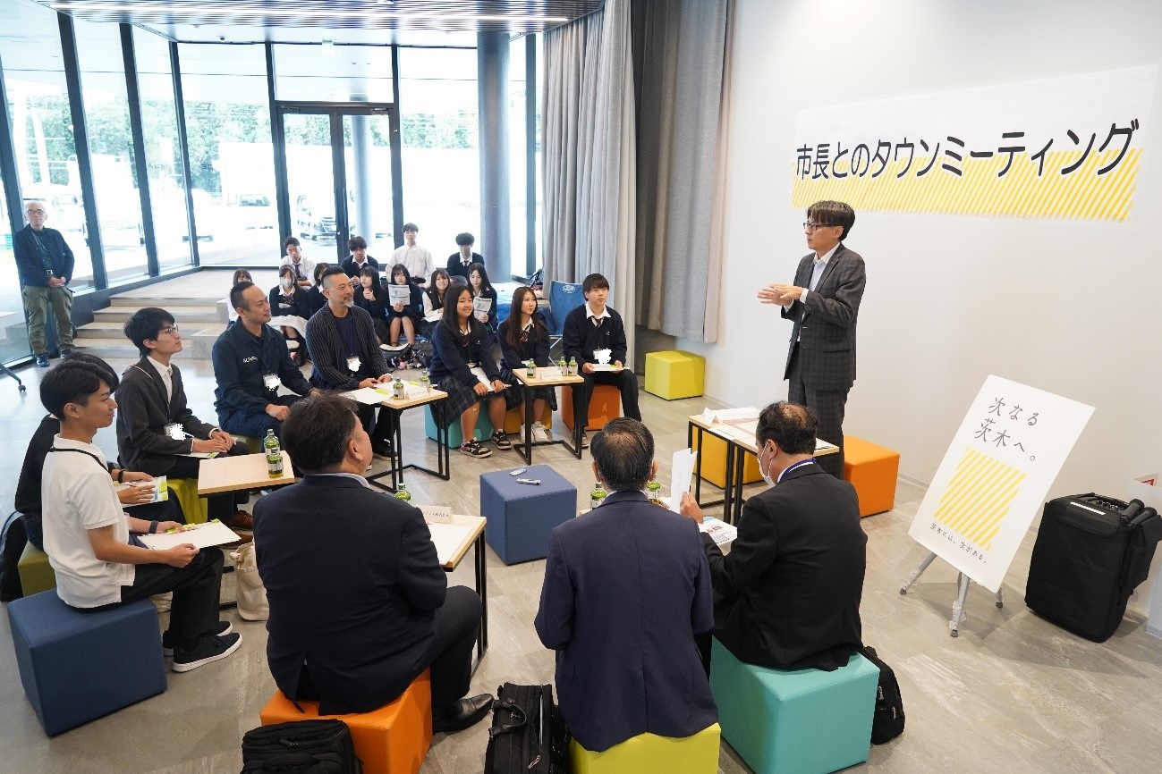 福岡市長と日本GLP株式会社、アークランズ株式会社、株式会社ヤマダホールディングス、立命館大学、大阪府立北摂つばさ高等学校の皆さんで、『「イコクルいばらき」共創によるまちづくり』をテーマに、2024年7月に竣工した日本GLP株式会社の大規模多機能物流施設である「GLP ALFALINK茨木1」をお借りしてタウンミーティングを実施しました。