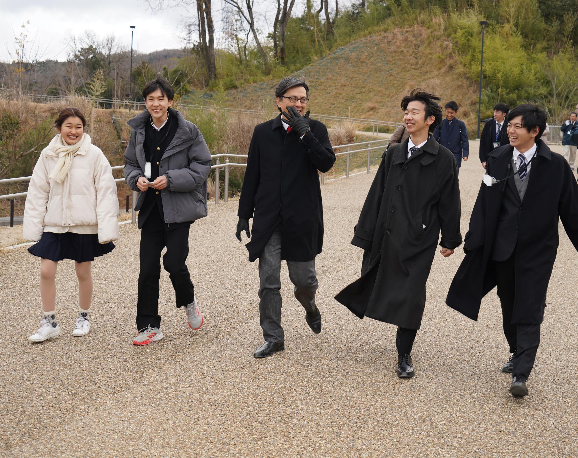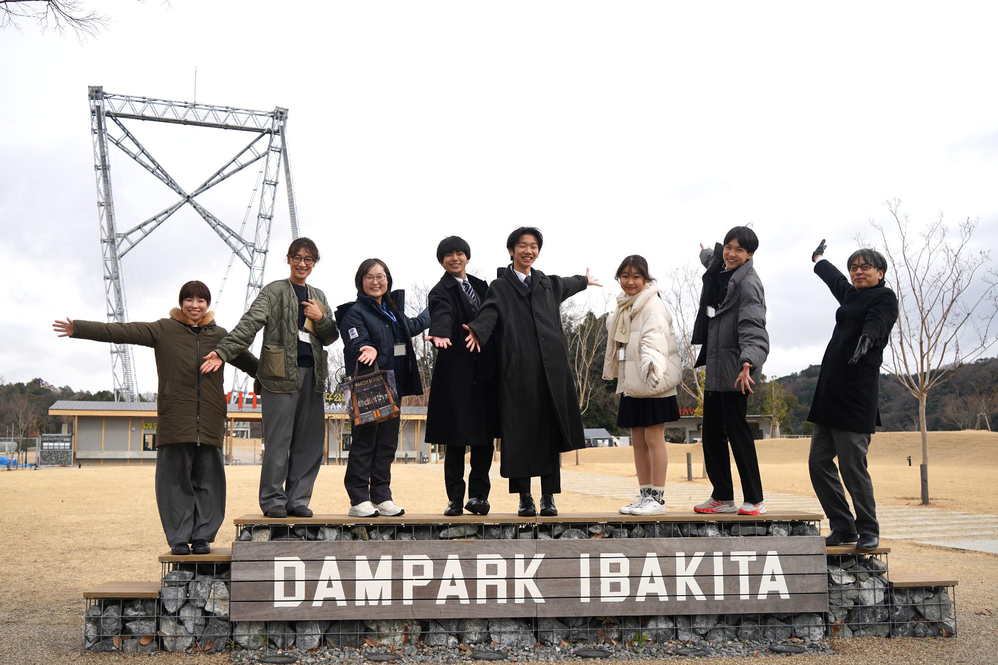 ミーティング前に、市長の案内で、参加者や関係者とともにパーク内を散策し、歩行者専用としては日本最長の420mを誇る吊り橋を見学しました。時折雪がちらつくなど非常に寒く風も強い状況ではありましたが、ダムパークいばきたを初めて訪れたという参加者も多く、皆さまの楽しそうな様子がとても印象的でした。