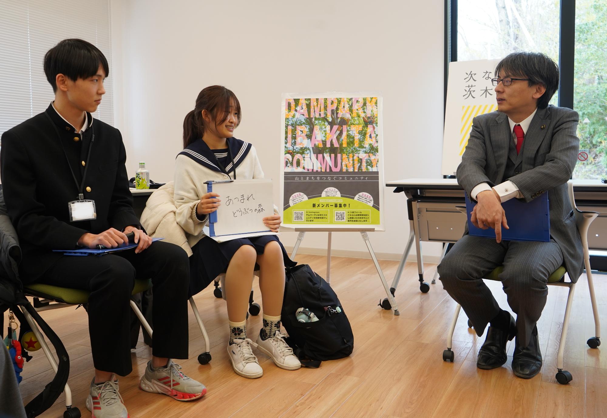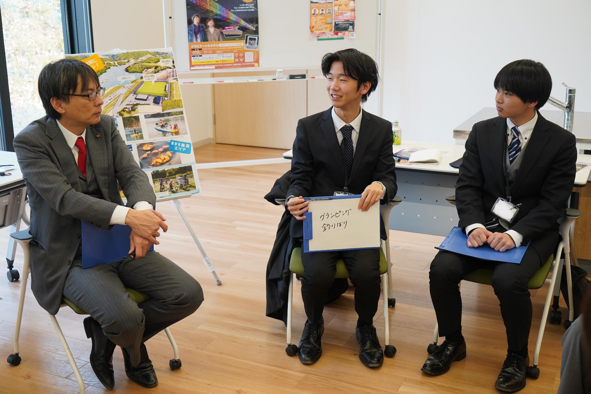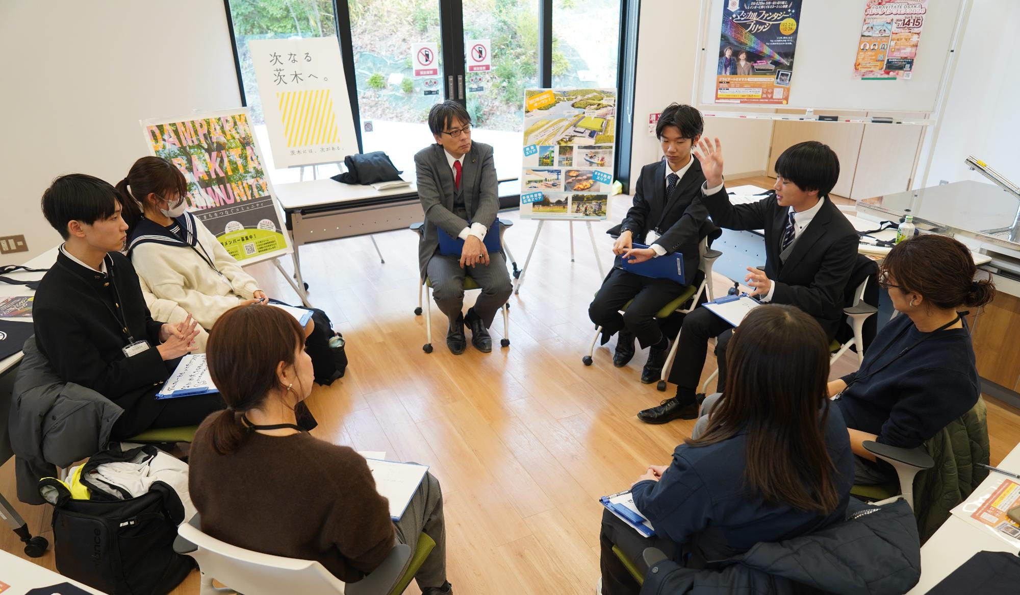 株式会社ユニバーサル園芸社、株式会社瑞光、ダムパークいばきたで公共施設の指定管理を行っている大和リース株式会社、追手門学院大学、大阪府立茨木高等学校の皆さまと福岡市長で、『ダムパークいばきたのある「いばきた」が愛されスポットになるためには』をテーマに、ダムパークいばきた内でタウンミーティングを実施しました。