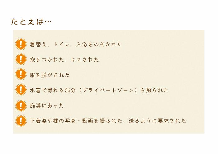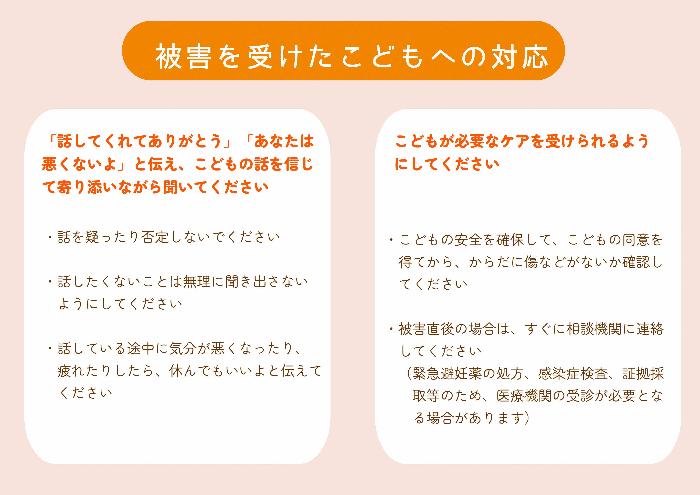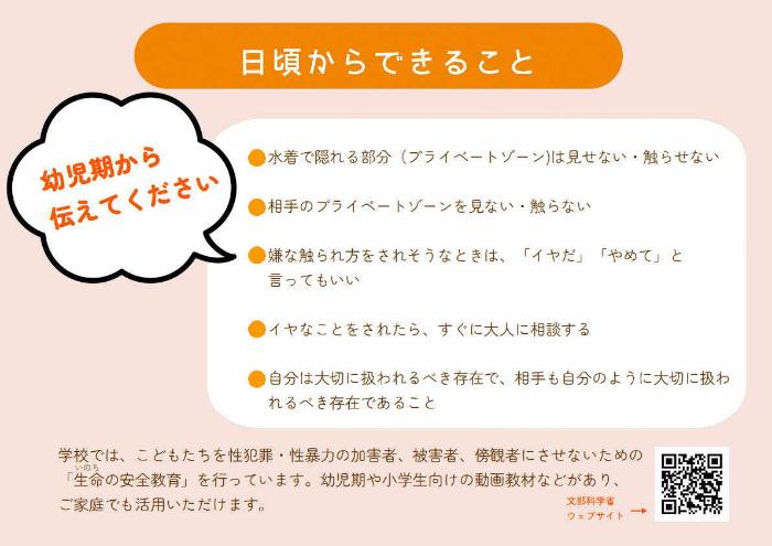こどもに対する性被害・性暴力は、被害にあった当事者の心身に長期にわたり有害な影響を及ぼす極めて悪質な行為です。相手と対等な関係でなかったり、断れない状況であったり、はっきり嫌だと言えない状況で、こどもたちが被害にあっています。