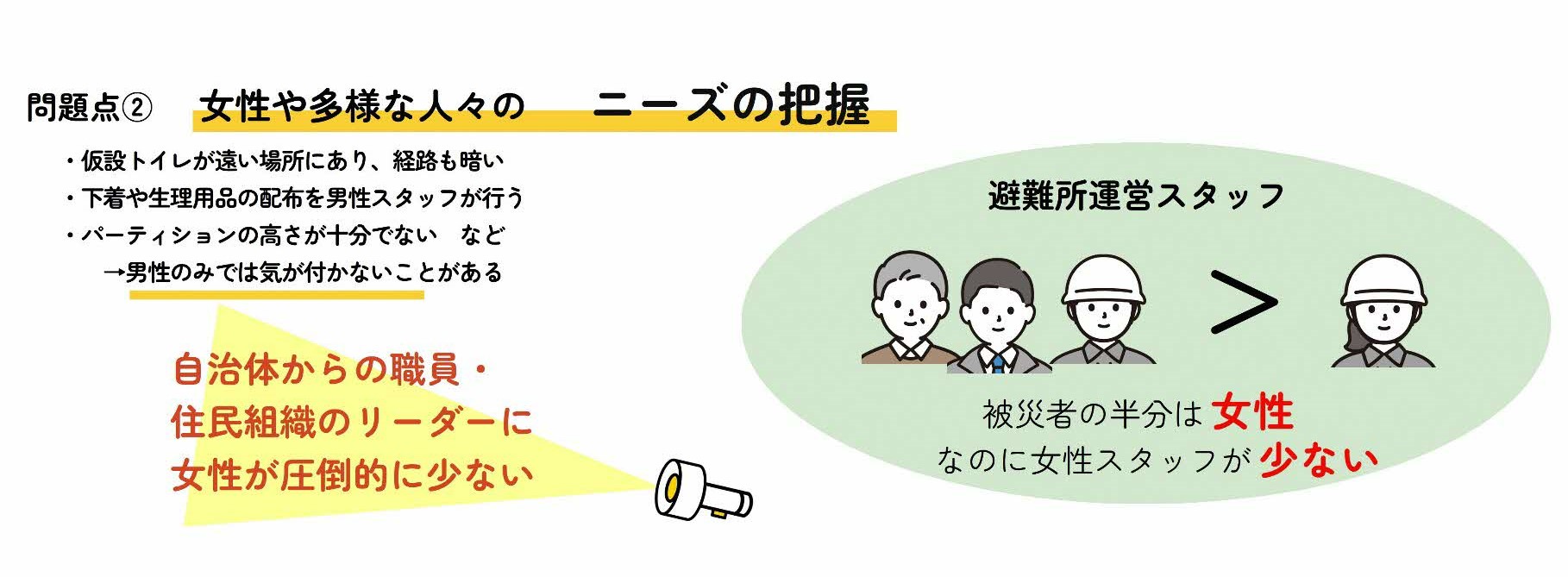 2024年1月に発生した能登半島地震では、避難所の運営や避難生活の環境改善に女性の視点が十分に反映されていない事例がありました。いつ起こるかわからない災害時に、女性や多様な人々が困らないようにするには、ふだんからどのように取り組んでいけばいいのでしょうか。