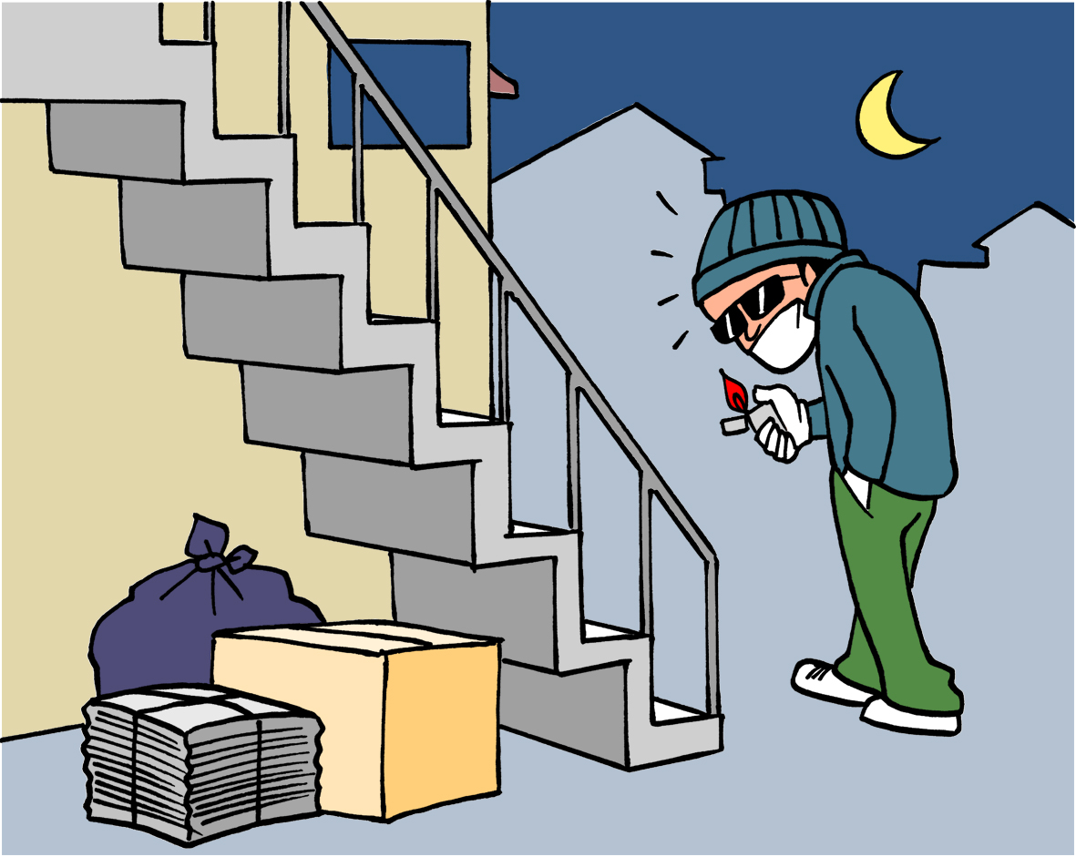 放火は人目につきにくい夜間に多く発生しています。不審な人を見かけたら警察に通報するなど、地域ぐるみの協力体制が、放火されにくい環境を作ります。また、放火されやすい暗がりをなくすため、玄関の表札灯を夜間点灯したり、防犯用センサーライトなどを設置しましょう。