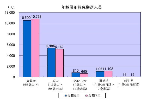 令和7年中の年齢層別搬送人員は第1位が高齢者で10,768人、第2位が成人で5,167人、第3位が乳幼児で1,108人、第4位が少年・少女で665人、第5位が新生児で15人となっています。