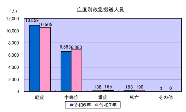 令和7年中の症度別搬送人員は第1位が軽症で10,505人、第2位が中等症で6,863人、第3位が死亡で190人、第4位が重症で165人となっています。