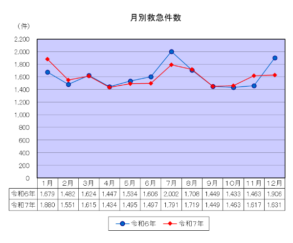 令和7年中の月別救急件数は、1月が最も多く1,880件、4月が最も少ない1,434件となっています。