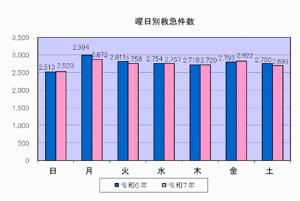 令和7年中の曜日別救急件数は、月曜日が最も多く2,872件、日曜日が最も少なく2,520件となっています。