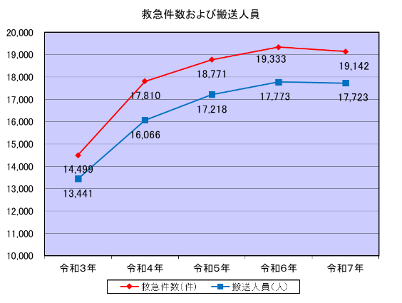 令和7年中の救急件数は19,142件で、前年と比べ191件の減少となり、1日平均約52件です。
