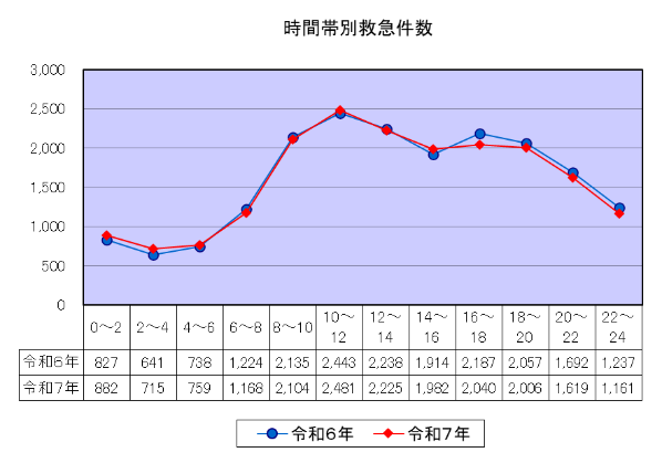 令和7年中の時間帯別救急件数は、10時~12時が最も多く2,481件、2時~4時が最も少なく715件となっています。