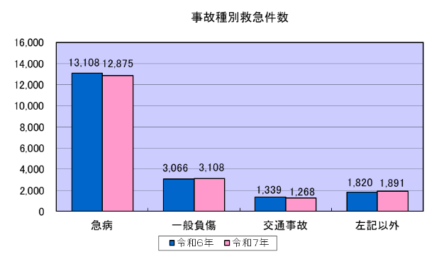 令和7年中の救急件数を事故種別ごとにみると第1位が急病で12,875件、第2位が一般負3,108件、第3位が交通事故で1,268件となっています。