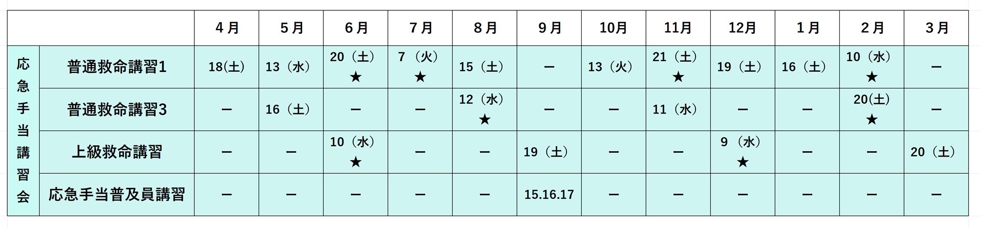 | 普通救命講習3 | 13:00~16:00(3時間) | 14:00~16:00(2時間) |
