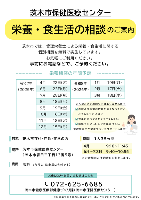 栄養相談の実施日は広報いばらきをご確認いただき、お電話にてご予約ください。